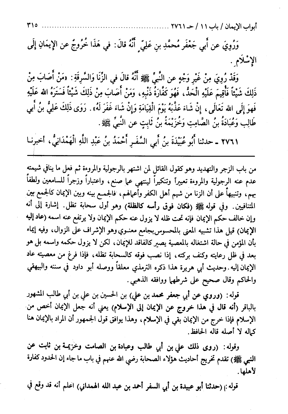 قَوْلُهُ (وَرُوِيَ عَنْ أَبِي جَعْفَرٍ مُحَمَّدِ بْنِ عَلِيِّ) بْنِ الْحُسَيْنِ بْنِ عَلِيِّ بْنِ أَبِي طَالِبٍ الْمَشْهُورِ بِالْبَاقِرِ (أَنَّهُ قَالَ فِي هَذَا خُرُوجٌ عَنِ الْإِيمَانِ إِلَى الْإِسْلَامِ) يَعْنِي أَنَّهُ جَعَلَ الْإِيمَانَ أَخَصَّ مِنَ الْإِسْلَامِ فَإِذَا خَرَجَ مِنَ الْإِيمَانِ بَقِيَ فِي الْإِسْلَامِ وَهَذَا يُوَافِقُ قَوْلَ الْجُمْهُورِ أَنَّ الْمُرَادَ بِالْإِيمَانِ هُنَا كَمَالُهُ لَا أَصْلُهُ قَالَهُ الْحَافِظُ