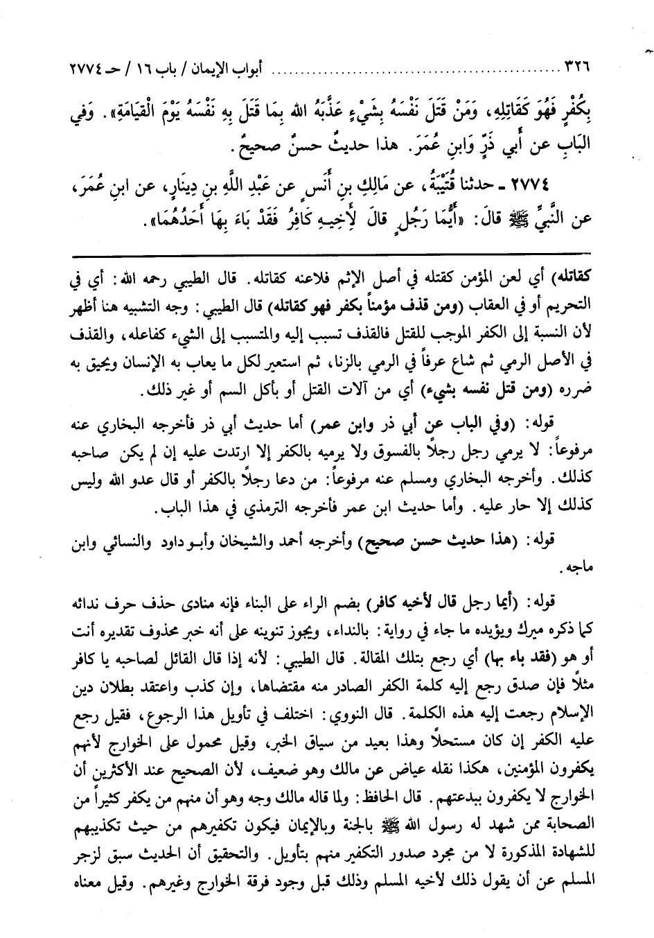 [2637] قَوْلُهُ (وَفِي الْبَابِ عَنْ أبي ذر وبن عُمَرَ) أَمَّا حَدِيثُ أَبِي ذَرٍّ فَأَخْرَجَهُ الْبُخَارِيُّ عَنْهُ مَرْفُوعًا لَا يَرْمِي رَجُلٌ رَجُلًا بِالْفُسُوقِ وَلَا يَرْمِيهِ بِالْكُفْرِ إِلَّا ارْتَدَّتْ عَلَيْهِ إِنْ لَمْ يَكُنْ صَاحِبُهُ كَذَلِكَ