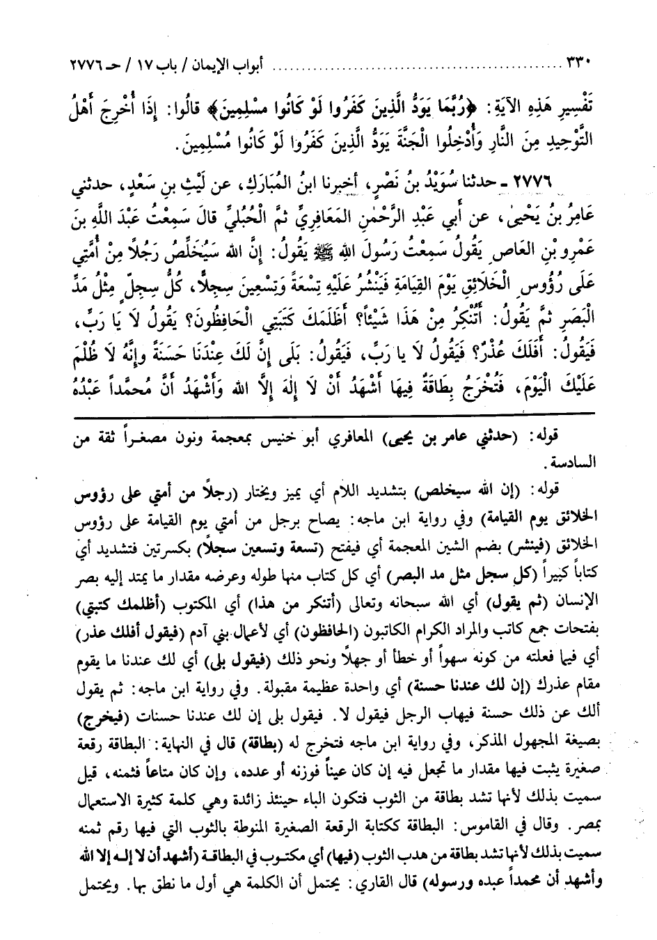 قَوْلُهُ (إِنَّ اللَّهَ سَيُخَلِّصُ) بِتَشْدِيدِ اللَّامِ أَيْ يميز ويختار (رجلا من أمتي على رؤوس الخلائق يوم القيامة) وفي رواية بن مَاجَهْ يُصَاحُ بِرَجُلٍ مِنْ أُمَّتِي يَوْمَ الْقِيَامَةِ على رؤوس الْخَلَائِقِ (فَيَنْشُرُ) بِضَمِّ الشِّينِ الْمُعْجَمَةِ أَيْ فَيَفْتَحُ (تِسْعَةً وَتِسْعِينَ سِجِلًّا) بِكِسْرَتَيْنِ فَتَشْدِيدٍ أَيْ كِتَابًا كَبِيرًا (كُلُّ سِجِلٍّ مِثْلُ مَدِّ الْبَصَرِ) أَيْ كُلُّ كِتَابٍ مِنْهَا طُولُهُ وَعَرْضُهُ مِقْدَارُ مَا يَمْتَدُّ إِلَيْهِ بَصَرُ الْإِنْسَانِ (ثُمَّ يَقُولُ) أَيِ اللَّهُ سُبْحَانَهُ وَتَعَالَى (أَتُنْكِرُ مِنْ هَذَا) أَيِ الْمَكْتُوبَ (أَظَلَمَكَ كَتَبَتِي) بِفَتَحَاتٍ جَمْعُ كَاتِبٍ وَالْمُرَادُ الْكِرَامُ الْكَاتِبُونَ (الْحَافِظُونَ) أَيْ لِأَعْمَالِ بَنِي آدَمَ فَيَقُولُ أَفَلَكَ عُذْرٌ أَيْ فِيمَا فَعَلْتَهُ مِنْ كَوْنِهِ سَهْوًا أَوْ خَطَأً أَوْ جَهْلًا وَنَحْوَ ذَلِكَ (فَيَقُولُ بَلَى) أَيْ لَكَ عِنْدَنَا مَا يَقُومُ مَقَامَ عُذْرِكَ (إِنَّ لَكَ عِنْدَنَا حَسَنَةً) أي واحدة عظيمة مقبولة