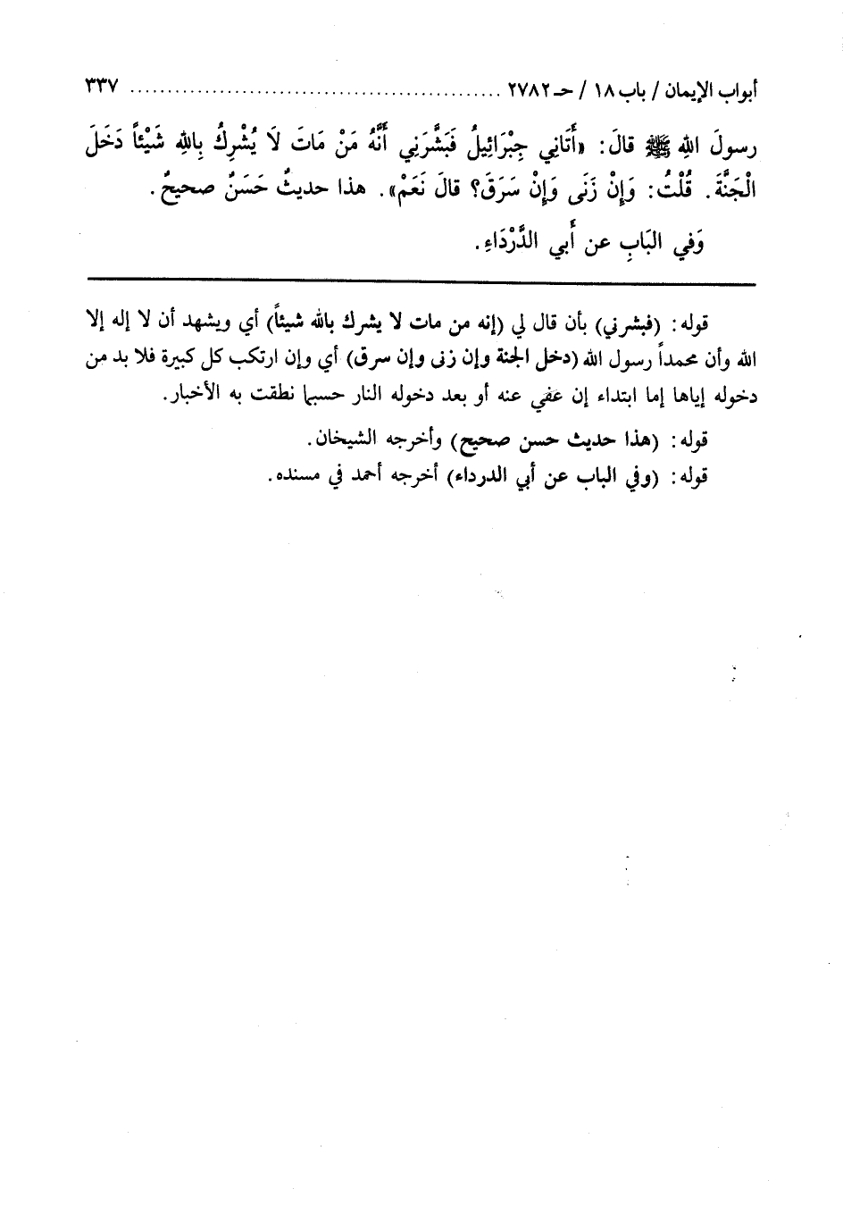 قَوْلُهُ (فَبَشَّرَنِي) بِأَنْ قَالَ لِي (إِنَّهُ مَنْ مَاتَ لَا يُشْرِكْ بِاللَّهِ شَيْئًا) أَيْ وَيَشْهَدُ أَنْ لَا إِلَهَ إِلَّا اللَّهُ وَأَنَّ مُحَمَّدًا رَسُولُ اللَّهِ (دَخَلَ الْجَنَّةَ وَإِنْ زَنَى وَإِنْ سَرَقَ) أَيْ وَإِنِ ارْتَكَبَ كُلَّ كَبِيرَةٍ فَلَا بُدَّ مِنْ دُخُولِهِ إِيَّاهَا إِمَّا ابْتِدَاءً إِنْ عُفِيَ عَنْهُ أَوْ بَعْدَ دُخُولِهِ النَّارَ حَسْبَمَا نَطَقَتْ بِهِ الْأَخْبَارُ قَوْلُهُ (هَذَا حَدِيثٌ حَسَنٌ صَحِيحٌ) وَأَخْرَجَهُ الشَّيْخَانِ