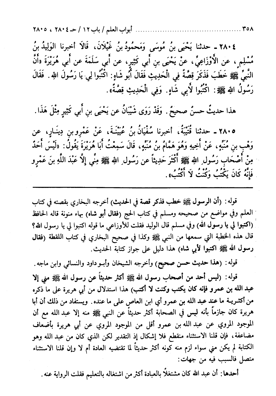 [2667] قَوْلُهُ (أَنَّ الرَّسُولَ صَلَّى اللَّهُ عَلَيْهِ وَسَلَّمَ خَطَبَ فَذَكَرَ قِصَّةً فِي الْحَدِيثِ) أَخْرَجَهُ الْبُخَارِيُّ بِقِصَّتِهِ فِي كِتَابِ الْعِلْمِ وَفِي مَوَاضِعَ مِنْ صَحِيحِهِ وَمُسْلِمٌ فِي كِتَابِ الْحَجِّ (فَقَالَ أَبُو شَاهٍ) بِهَاءٍ مُنَوَّنَةٍ قَالَهُ الْحَافِظُ (اكْتُبُوا لِي يَا رَسُولَ اللَّهِ) وَفِي مُسْلِمٍ قَالَ الْوَلِيدُ فَقُلْتُ لِلْأَوْزَاعِيِّ مَا قَوْلُهُ اكْتُبُوا لِي يَا رَسُولَ اللَّهِ قَالَ هَذِهِ الْخُطْبَةُ الَّتِي سَمِعَهَا مِنْ النَّبِيِّ صَلَّى اللَّهُ عَلَيْهِ وَسَلَّمَ وَكَذَا فِي صَحِيحِ الْبُخَارِيِّ فِي كِتَابِ اللُّقَطَةِ (فَقَالَ رَسُولُ اللَّهِ صَلَّى اللَّهُ عَلَيْهِ وَسَلَّمَ اكْتُبُوا لِأَبِي شَاهٍ) هَذَا دَلِيلٌ صَرِيحٌ عَلَى جَوَازِ كِتَابَةِ الْحَدِيثَ