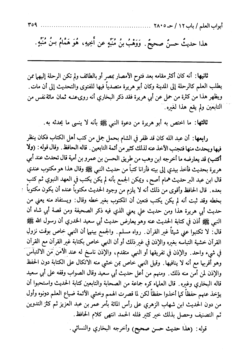 قَالَ الْعُلَمَاءُ كَرِهَ جَمَاعَةٌ مِنَ الصَّحَابَةِ وَالتَّابِعِينَ كِتَابَةَ الْحَدِيثِ وَاسْتَحَبُّوا أَنْ يُؤْخَذَ عَنْهُمْ حِفْظًا كَمَا أَخَذُوا حِفْظًا لَكِنْ لَمَّا قَصُرَتِ الْهِمَمُ وَخَشِيَ الْأَئِمَّةُ ضَيَاعَ الْعِلْمِ دونوه وأول من دون الحديث بن شِهَابٍ الزُّهْرِيُّ عَلَى رَأْسِ الْمِائَةِ بِأَمْرِ عُمَرَ بْنِ عَبْدِ الْعَزِيزِ ثُمَّ كَثُرَ التَّدْوِينُ ثُمَّ التَّصْنِيفُ وَحَصَلَ بِذَلِكَ خَيْرٌ كَثِيرٌ فَلِلَّهِ الْحَمْدُ انْتَهَى كَلَامُ الْحَافِظِ