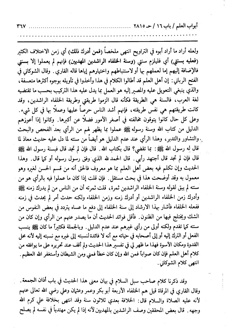 وَقَالَ الشَّوْكَانِيُّ فِي الْفَتْحِ الرَّبَّانِيِّ إِنَّ أَهْلَ الْعِلْمِ قَدْ أَطَالُوا الْكَلَامَ فِي هَذَا وَأَخَذُوا فِي تَأْوِيلِهِ بِوُجُوهٍ أَكْثَرُهَا مُتَعَسِّفَةٌ وَالَّذِي يَنْبَغِي التَّعْوِيلُ عَلَيْهِ وَالْمَصِيرُ إِلَيْهِ هُوَ الْعَمَلُ بِمَا يَدُلُّ عَلَيْهِ هَذَا التَّرْكِيبُ بِحَسْبِ مَا تَقْتَضِيهِ لُغَةُ الْعَرَبِ فَالسُّنَّةُ هِيَ الطَّرِيقَةُ فَكَأَنَّهُ قَالَ الْزَمُوا طَرِيقَتِي وَطَرِيقَةَ الْخُلَفَاءِ الرَّاشِدِينَ وَقَدْ كَانَتْ طَرِيقَتُهُمْ هِيَ نَفْسُ طَرِيقَتِهِ فَإِنَّهُمْ أَشَدُّ النَّاسِ حِرْصًا عَلَيْهَا وَعَمَلًا بِهَا فِي كُلِّ شَيْءٍ