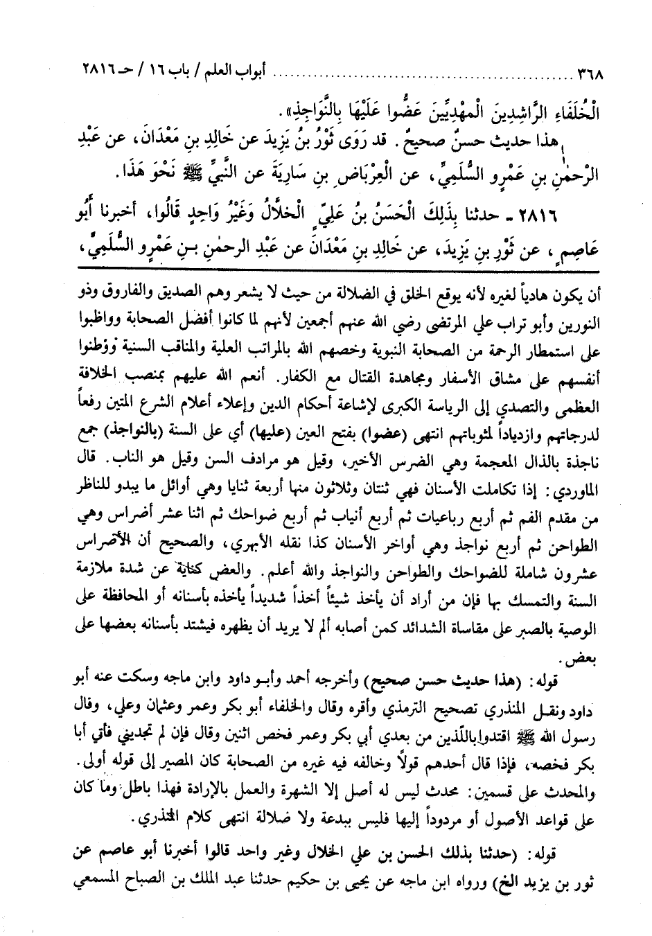 أَنْعَمَ اللَّهُ عَلَيْهِمْ بِمَنْصِبِ الْخِلَافَةِ الْعُظْمَى وَالتَّصَدِّي إِلَى الرِّيَاسَةِ الْكُبْرَى لِإِشَاعَةِ أَحْكَامِ الدِّينِ وَإِعْلَاءِ أَعْلَامِ الشَّرْعِ الْمَتِينِ رَفْعًا لِدَرَجَاتِهِمْ وَازْدِيَادًا لِمَثُوبَاتِهِمْ انْتَهَى (عَضُّوا) بِفَتْحِ الْعَيْنِ (عَلَيْهَا) أَيْ عَلَى السُّنَّةِ (بِالنَّوَاجِذِ) جَمْعُ نَاجِذَةٍ بِالذَّالِ الْمُعْجَمَةِ وَهِيَ الضِّرْسُ الْأَخِيرُ وَقِيلَ هُوَ مُرَادِفُ السِّنِّ وَقِيلَ هُوَ الناب