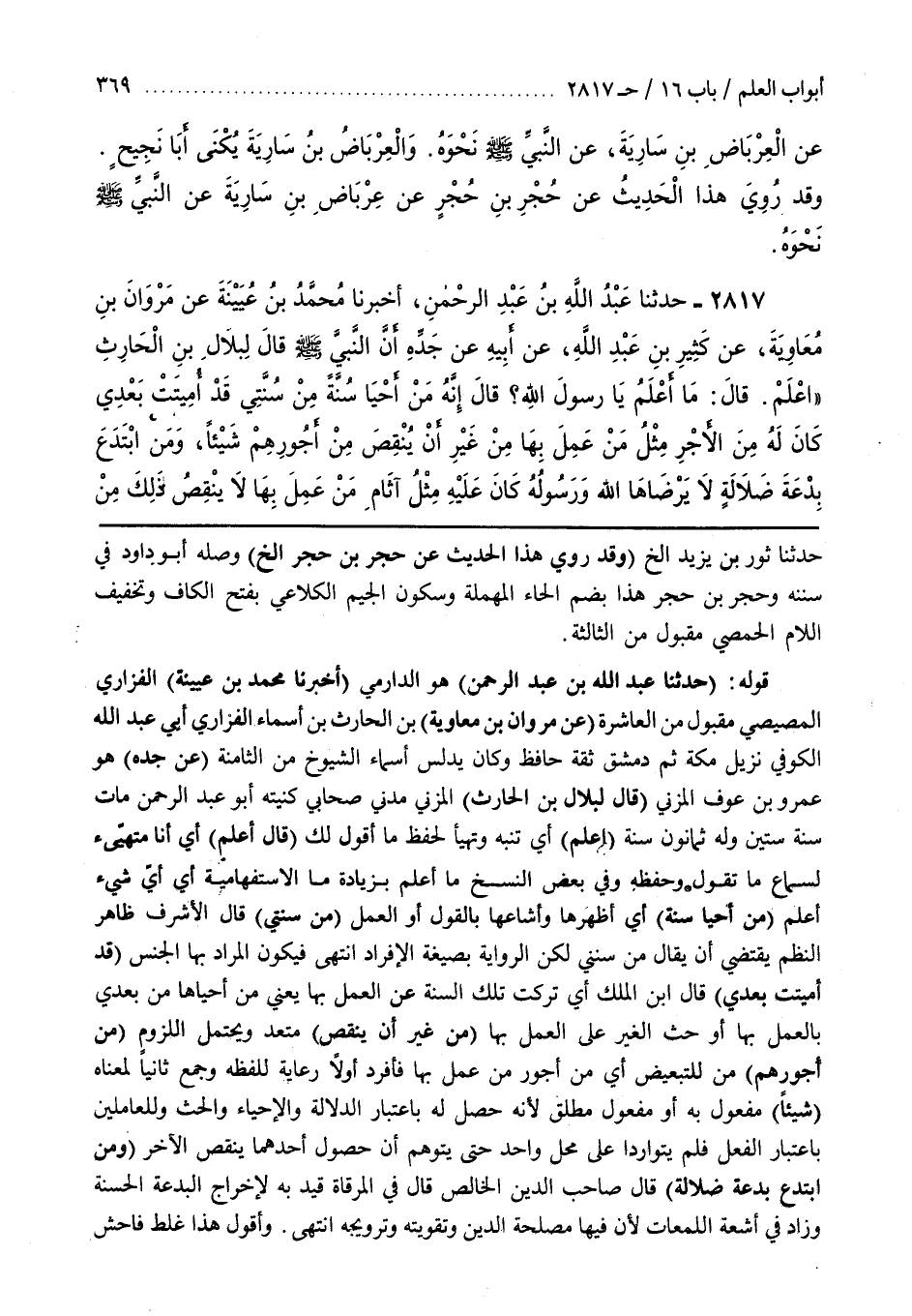 [2677] قَوْلُهُ (حَدَّثَنَا عَبْدُ اللَّهِ بْنُ عَبْدِ الرَّحْمَنِ) هُوَ الدَّارِمِيُّ (أَخْبَرَنَا مُحَمَّدُ بْنُ عُيَيْنَةَ) الْفَزَارِيُّ الْمَصِّيصِيُّ مَقْبُولٌ مِنَ الْعَاشِرَةِ (عَنْ مَرْوَانَ بْنِ مُعَاوِيَةَ) بْنِ الْحَارِثِ بْنِ أَسْمَاءَ الفزري أَبِي عَبْدِ اللَّهِ الْكُوفِيِّ نَزِيلُ مَكَّةَ ثُمَّ دِمَشْقَ ثِقَةٌ حَافِظٌ وَكَانَ يُدَلِّسُ أَسْمَاءَ الشُّيُوخِ مِنَ الثَّامِنَةِ (عَنْ جَدِّهِ) هُوَ عَمْرُو بْنُ عَوْفٍ الْمُزَنِيُّ (قَالَ لِبِلَالِ بْنِ الْحَارِثِ) الْمُزَنِيِّ مَدَنِيٌّ صَحَابِيٌّ كُنْيَتُهُ أَبُو عَبْدِ الرَّحْمَنِ مَاتَ سَنَةَ سِتِّينَ وَلَهُ ثَمَانُونَ سَنَةً (اعْلَمْ) أَيْ تَنَبَّهْ وَتَهَيَّأْ لِحِفْظِ مَا أَقُولُ لَكَ (قَالَ أعلم) أي أنا متهيىء لِسَمَاعِ مَا تَقُولُ وَحِفْظِهِ رَضِيَ اللَّهُ عَنْهُ وَفِي بَعْضِ النُّسَخِ مَا أَعْلَمُ بِزِيَادَةِ مَا الِاسْتِفْهَامِيَّةِ أَيْ أَيُّ شَيْءٍ أَعْلَمُ (مَنْ أَحْيَا سُنَّةً) أَيْ أَظْهَرَهَا وَأَشَاعَهَا بِالْقَوْلِ أَوِ الْعَمَلِ (من سنني) قَالَ الْأَشْرَفُ ظَاهِرُ النَّظْمِ يَقْتَضِي أَنْ يُقَالَ مِنْ سُنَنِي لَكِنَّ الرِّوَايَةَ بِصِيغَةِ الْإِفْرَادِ انْتَهَى فَيَكُونُ الْمُرَادُ بِهَا الْجِنْسَ (قَدْ أُمِيتَتْ بَعْدِي) قال بن الْمَلَكِ أَيْ تُرِكَتْ تِلْكَ السُّنَّةُ عَنِ الْعَمَلِ بِهَا يَعْنِي مَنْ أَحْيَاهَا مِنْ بَعْدِي بِالْعَمَلِ بِهَا أَوْ حَثَّ الْغَيْرَ عَلَى الْعَمَلِ بِهَا (مِنْ غَيْرِ أَنْ يُنْقِصَ) مُتَعَدٍّ وَيَحْتَمِلُ اللُّزُومَ (من أجورهم) من التبعيض أَيْ مِنْ أُجُورِ مَنْ عَمِلَ بِهَا فَأَفْرَدَ أَوَّلًا رِعَايَةً لِلَفْظِهِ وَجَمَعَ ثَانِيًا لِمَعْنَاهُ (شَيْئًا) مَفْعُولٌ بِهِ أَوْ مَفْعُولٌ مُطْلَقٌ لِأَنَّهُ حَصَلَ له باعتبار الدلالة والإحياء والحق وَلِلْعَامِلَيْنِ بِاعْتِبَارِ الْفِعْلِ فَلَمْ يَتَوَارَدَا عَلَى مَحَلٍّ وَاحِدٍ حَتَّى يُتَوَهَّمَ أَنَّ حُصُولَ أَحَدِهِمَا يُنْقِصُ الْآخَرَ (وَمَنِ ابْتَدَعَ بِدْعَةَ ضَلَالَةٍ) قَالَ صَاحِبُ الدِّينِ الْخَالِصِ قَالَ فِي الْمِرْقَاةِ قَيَّدَ بِهِ لِإِخْرَاجِ الْبِدْعَةِ الْحَسَنَةِ وَزَادَ فِي أَشِعَّةِ اللُّمَعَاتِ لِأَنَّ فِيهَا مَصْلَحَةَ الدِّينِ وَتَقْوِيَتَهُ وَتَرْوِيجَهُ انْتَهَى