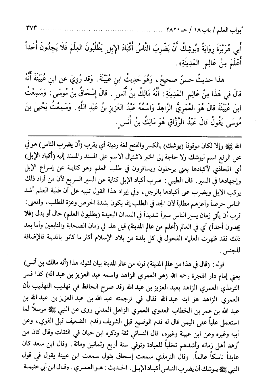 اللَّهِ صَلَّى اللَّهُ عَلَيْهِ وَسَلَّمَ وَإِلَّا لَكَانَ مَوْقُوفًا (يُوشِكُ) بِالْكَسْرِ وَالْفَتْحُ لُغَةٌ رَدِيئَةٌ أَيْ يَقْرُبُ (أَنْ يَضْرِبَ النَّاسُ) هُوَ فِي مَحَلِّ الرفع اسم ليوشك ولا حاجة إلى الخير لِاشْتِمَالِ الِاسْمِ عَلَى الْمُسْنَدِ وَالْمُسْنَدِ إِلَيْهِ (أَكْبَادَ الْإِبِلِ) أَيِ الْمُحَاذِيَ لِأَكْبَادِهَا يَعْنِي يَرْحَلُونَ وَيُسَافِرُونَ فِي طَلَبِ الْعِلْمِ وَهُوَ كِنَايَةٌ عَنْ إِسْرَاعِ الْإِبِلِ وَإِجْهَادِهَا فِي السَّيْرِ