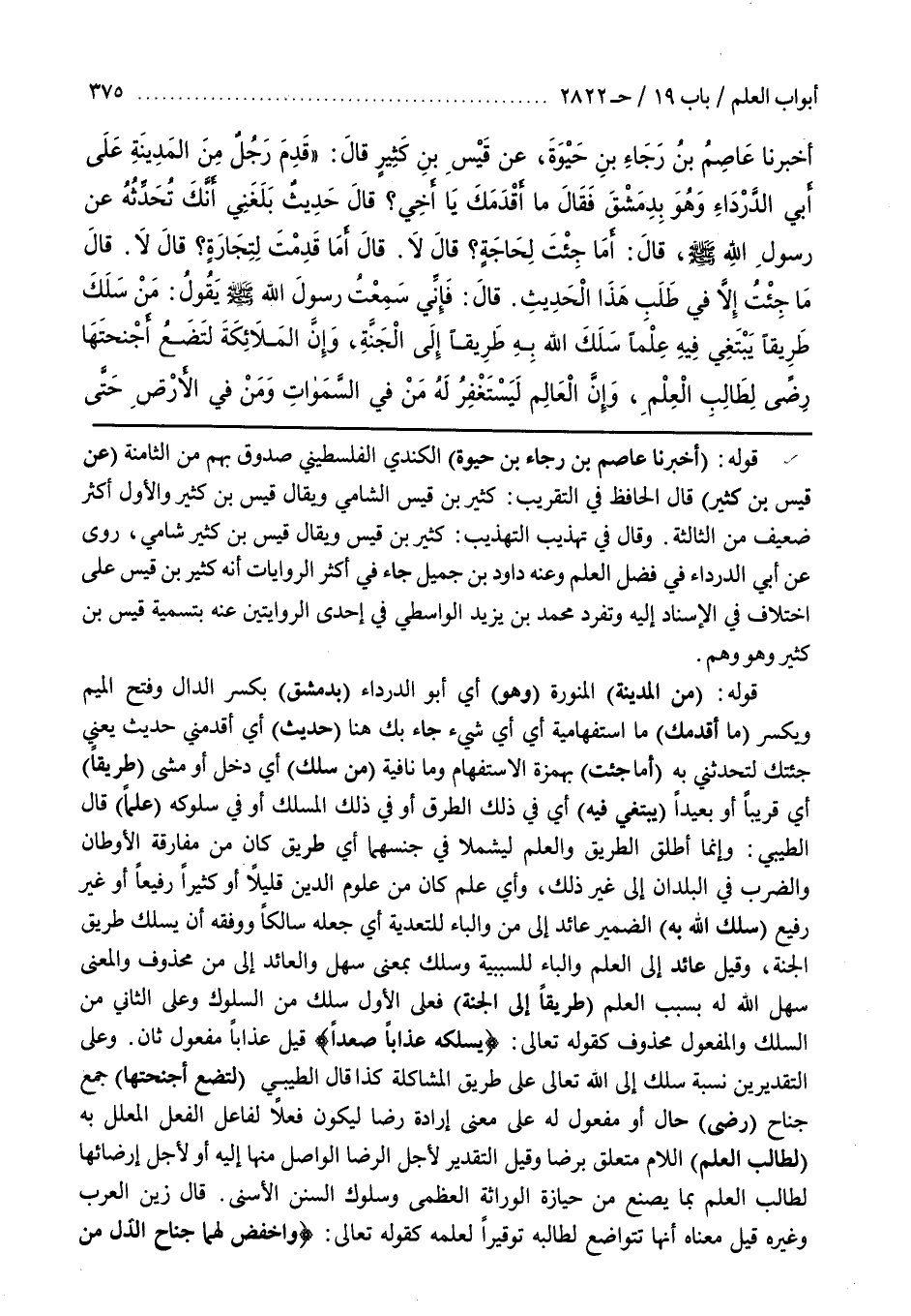 قَوْلُهُ (مِنَ الْمَدِينَةِ) الْمُنَوَّرَةِ (وَهُوَ) أَيْ أَبُو الدَّرْدَاءِ (بِدِمَشْقَ) بِكَسْرِ الدَّالِ وَفَتْحِ الْمِيمِ وَيُكْسَرُ (مَا أَقْدَمَكَ) مَا اسْتِفْهَامِيَّةٌ أَيْ أَيُّ شَيْءٍ جَاءَ بِكَ هُنَا (حَدِيثٌ) أَيْ أَقْدَمَنِي حَدِيثٌ يَعْنِي جِئْتُكَ لِتُحَدِّثَنِي بِهِ (أَمَا جِئْتَ) بِهَمْزَةِ الِاسْتِفْهَامِ وَمَا نَافِيَةٌ (مَنْ سَلَكَ) أَيْ دَخَلَ أَوْ مَشَى (طَرِيقًا) أَيْ قَرِيبًا أَوْ بَعِيدًا (يَبْتَغِي فِيهِ) أَيْ فِي ذَلِكَ الطَّرِيقِ أَوْ فِي ذَلِكَ الْمَسْلَكِ أَوْ فِي سُلُوكِهِ (عِلْمًا) قَالَ الطِّيبِيُّ وَإِنَّمَا أَطْلَقَ الطَّرِيقَ وَالْعِلْمَ لِيَشْمَلَا فِي جِنْسِهِمَا أَيَّ طَرِيقٍ كَانَ مِنْ مُفَارَقَةِ الْأَوْطَانِ وَالضَّرْبِ فِي الْبُلْدَانِ إِلَى غَيْرِ ذَلِكَ وَأَيَّ عِلْمٍ كَانَ مِنْ عُلُومِ الدِّينِ قليلا أو كثيرا رفعيا أَوْ غَيْرَ رَفِيعٍ (سَلَكَ اللَّهُ بِهِ) الضَّمِيرُ عَائِدٌ إِلَى مَنْ وَالْبَاءُ لِلتَّعْدِيَةِ أَيْ جَعَلَهُ سَالِكًا وَوَفَّقَهُ أَنْ يَسْلُكَ طَرِيقَ الْجَنَّةِ وَقِيلَ عَائِدٌ إِلَى الْعِلْمِ وَالْبَاءُ لِلسَّبَبِيَّةِ وَسَلَكَ بِمَعْنَى سَهَّلَ وَالْعَائِدُ إِلَى مَنْ مَحْذُوفٌ وَالْمَعْنَى سَهَّلَ اللَّهُ لَهُ بِسَبَبِ الْعِلْمِ (طَرِيقًا إِلَى الْجَنَّةِ) فَعَلَى الْأَوَّلِ سَلَكَ مِنَ السُّلُوكِ وَعَلَى الثَّانِي من السلك والمفعول محذوف كقوله تعالى ويسلكه عذابا صعدا قيل عذابا مفعول ثان