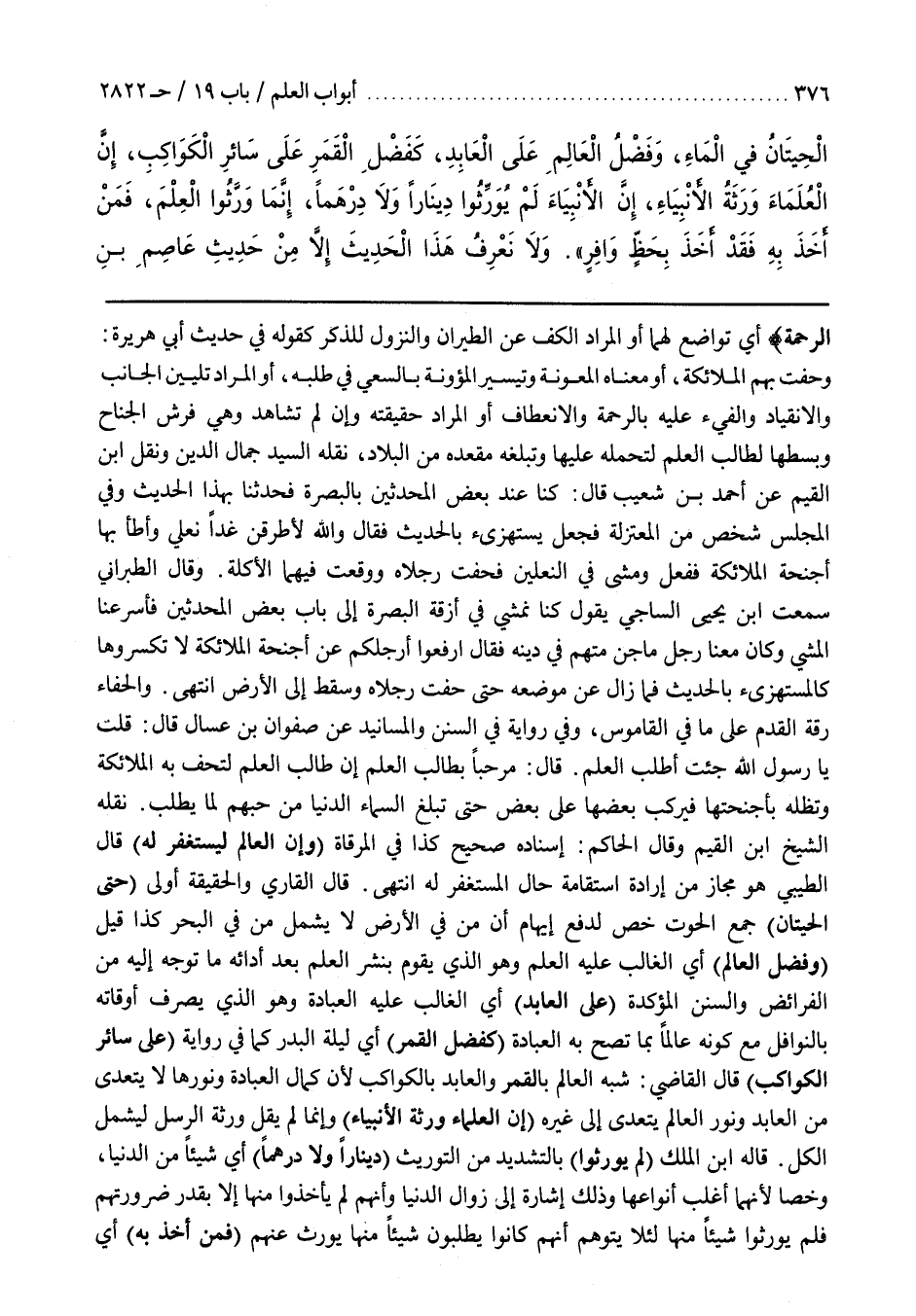قال القارىء وَالْحَقِيقَةُ أَوْلَى (حَتَّى الْحِيتَانُ) جَمْعُ الْحُوتِ خُصَّ لِدَفْعِ إِيهَامِ أَنَّ مَنْ فِي الْأَرْضِ لَا يَشْمَلُ مَنْ فِي الْبَحْرِ كَذَا قِيلَ (وَفَضْلُ الْعَالِمِ) أَيِ الْغَالِبُ عَلَيْهِ الْعِلْمُ وَهُوَ الَّذِي يَقُومُ بِنَشْرِ الْعِلْمِ بَعْدَ أَدَائِهِ مَا تَوَجَّهَ إِلَيْهِ مِنَ الْفَرَائِضِ وَالسُّنَنِ الْمُؤَكَّدَةِ (عَلَى الْعَابِدِ) أَيِ الْغَالِبِ عَلَيْهِ الْعِبَادَةُ وَهُوَ الَّذِي يَصْرِفُ أَوْقَاتَهُ بِالنَّوَافِلِ مَعَ كَوْنِهِ عَالِمًا بِمَا تَصِحُّ بِهِ الْعِبَادَةُ (كَفَضْلِ الْقَمَرِ) أَيْ لَيْلَةَ الْبَدْرِ كَمَا فِي رِوَايَةٍ (عَلَى سَائِرِ الْكَوَاكِبِ) قَالَ الْقَاضِي شَبَّهَ الْعَالِمَ بِالْقَمَرِ وَالْعَابِدَ بِالْكَوَاكِبِ لِأَنَّ كَمَالَ الْعِبَادَةِ وَنُورَهَا لَا يَتَعَدَّى مِنَ الْعَابِدِ وَنُورُ الْعَالِمِ يَتَعَدَّى إِلَى غَيْرِهِ (إِنَّ الْعُلَمَاءَ وَرَثَةُ الْأَنْبِيَاءِ) وَإِنَّمَا لَمْ يَقُلْ وَرَثَةُ الرُّسُلِ ليشمل الكل