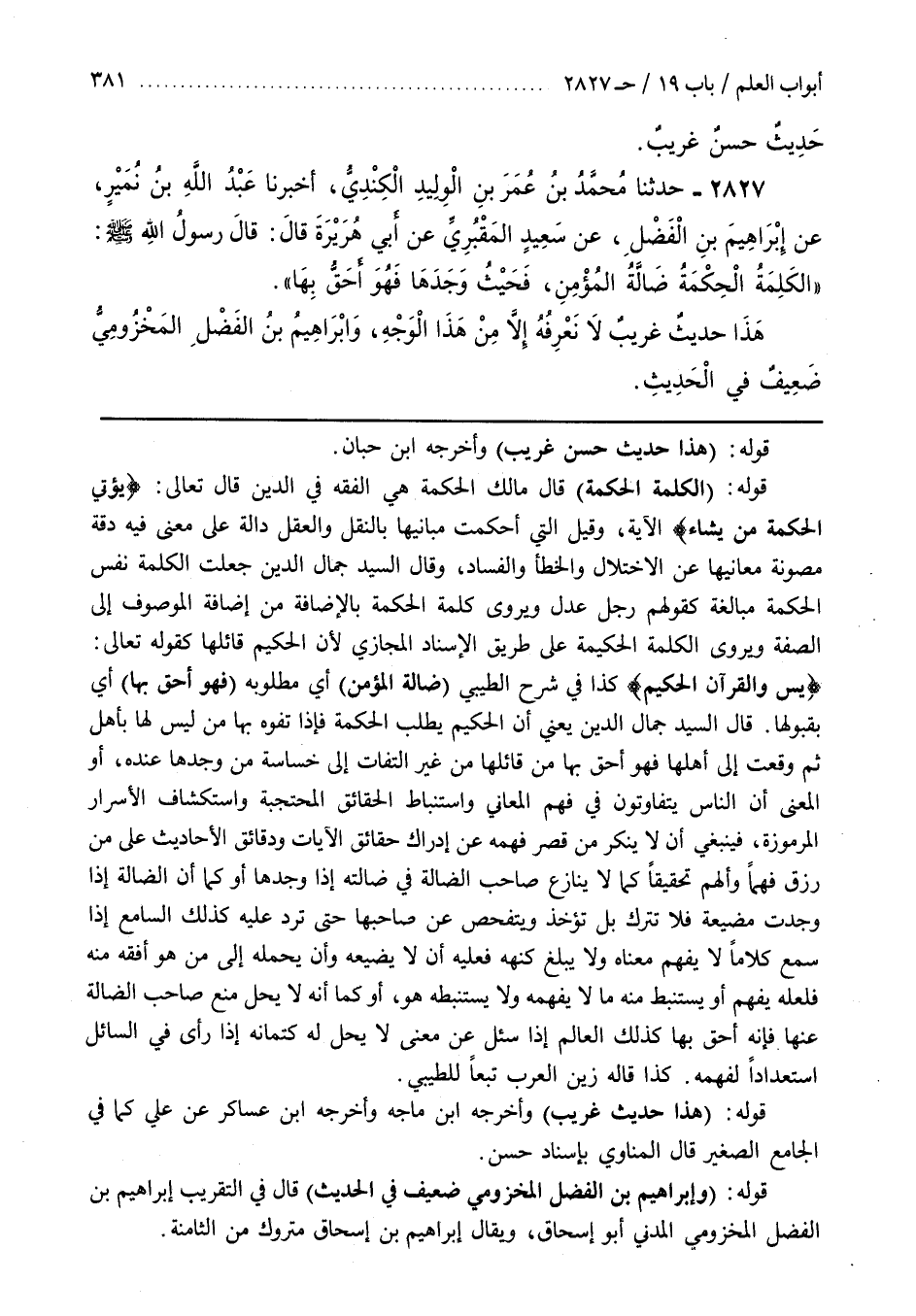 قَالَ السَّيِّدُ جَمَالُ الدِّينِ يَعْنِي أَنَّ الْحَكِيمَ يَطْلُبُ الْحِكْمَةَ فَإِذَا وَجَدَهَا فَهُوَ أَحَقُّ بِهَا أَيْ بِالْعَمَلِ بِهَا وَاتِّبَاعِهَا أَوِ الْمَعْنَى أَنَّ كَلِمَةَ الْحِكْمَةِ رُبَّمَا تَفَوَّهَ بِهَا مَنْ لَيْسَ لَهَا بِأَهْلٍ ثُمَّ وَقَعَتْ إِلَى أَهْلِهَا فَهُوَ أَحَقُّ بِهَا مِنْ قَائِلِهَا مِنْ غَيْرِ الْتِفَاتٍ إِلَى خَسَاسَةِ مَنْ وَجَدَهَا عِنْدَهُ أَوِ الْمَعْنَى أَنَّ النَّاسَ يَتَفَاوَتُونَ فِي فَهْمِ الْمَعَانِي وَاسْتِنْبَاطِ الْحَقَائِقِ الْمُحْتَجِبَةِ وَاسْتِكْشَافِ الْأَسْرَارِ الْمَرْمُوزَةِ فَيَنْبَغِي أَنْ لَا يُنْكِرَ مَنْ قَصُرَ فَهْمُهُ عَنْ إِدْرَاكِ حَقَائِقِ الْآيَاتِ وَدَقَائِقِ الْأَحَادِيثِ عَلَى مَنْ رُزِقَ فَهْمًا وَأُلْهِمَ تَحْقِيقًا كَمَا لَا يُنَازِعُ صَاحِبَ الضَّالَّةِ فِي ضَالَّتِهِ إِذَا وَجَدَهَا أَوْ كَمَا أَنَّ الضَّالَّةَ إِذَا وُجِدَتْ مُضَيَّعَةً فَلَا تُتْرَكُ بَلْ تُؤْخَذُ وَيُتَفَحَّصُ عَنْ صَاحِبِهَا حَتَّى تُرَدَّ عَلَيْهِ كَذَلِكَ السَّامِعُ إِذَا سَمِعَ كَلَامًا لَا يَفْهَمُ مَعْنَاهُ وَلَا يَبْلُغُ كُنْهَهُ فَعَلَيْهِ أَنْ لَا يُضَيِّعَهُ وَأَنْ يَحْمِلَهُ إِلَى مَنْ هُوَ أَفْقَهُ مِنْهُ فَلَعَلَّهُ يَفْهَمُ أَوْ يَسْتَنْبِطُ مِنْهُ مَا لَا يَفْهَمُهُ وَلَا يَسْتَنْبِطُهُ هُوَ أَوْ كَمَا أَنَّهُ لَا يَحِلُّ مَنْعُ صَاحِبِ الضَّالَّةِ عَنْهَا فَإِنَّهُ أَحَقُّ بِهَا كَذَلِكَ الْعَالِمُ إِذَا سُئِلَ عَنْ مَعْنًى لَا يَحِلُّ لَهُ كِتْمَانُهُ إِذَا رَأَى فِي السَّائِلِ اسْتِعْدَادًا لِفَهْمِهِ