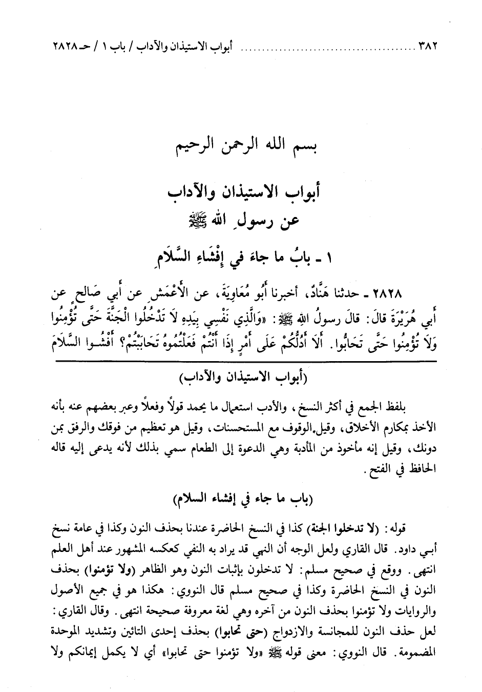 وَوَقَعَ فِي صَحِيحِ مُسْلِمٍ لَا تَدْخُلُونَ بِإِثْبَاتِ النُّونِ وَهُوَ الظَّاهِرُ (وَلَا تُؤْمِنُوا) بِحَذْفِ النُّونِ فِي النُّسَخِ الْحَاضِرَةِ وَكَذَا فِي صَحِيحِ مُسْلِمٍ