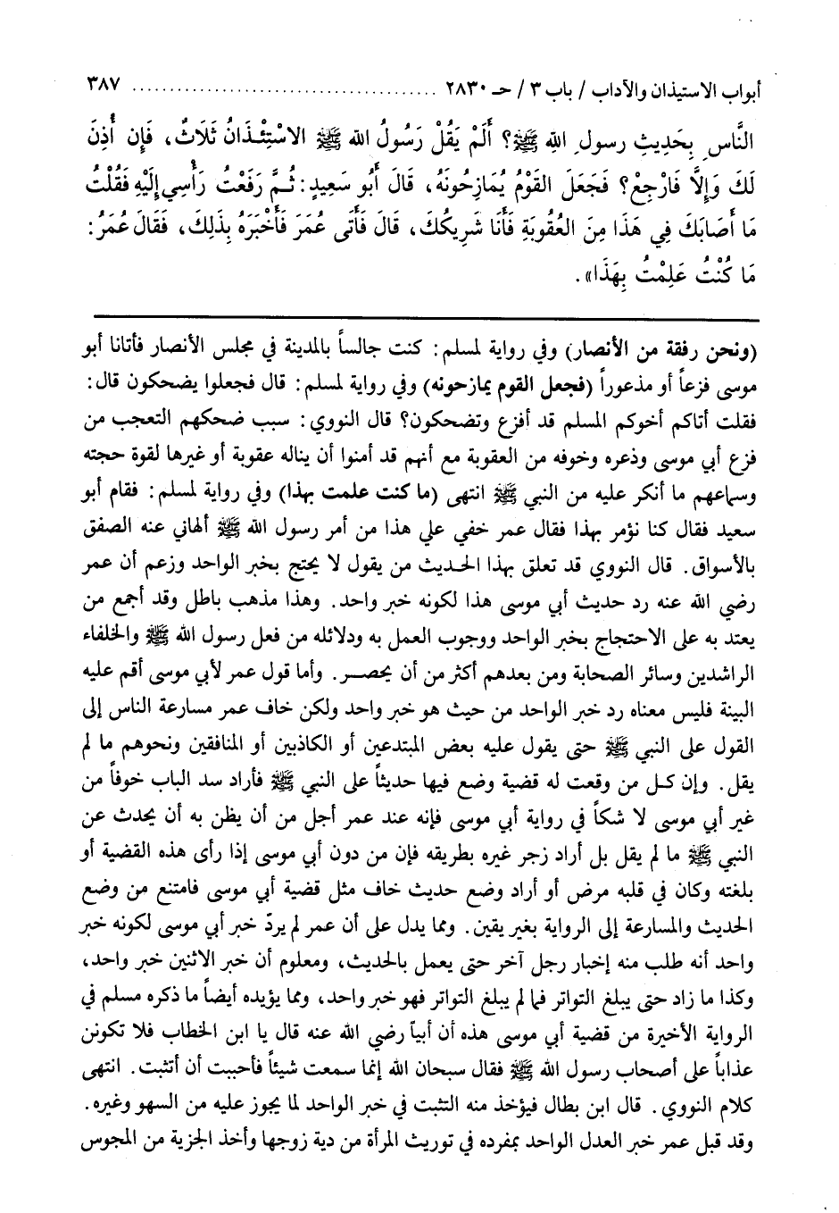 قَالَ النَّوَوِيُّ قَدْ تَعَلَّقَ بِهَذَا الْحَدِيثِ مَنْ يَقُولُ لَا يُحْتَجُّ بِخَبَرِ الْوَاحِدِ وَزَعَمَ أَنَّ عُمَرَ رَضِيَ اللَّهُ عَنْهُ رَدَّ حَدِيثَ أَبِي مُوسَى هَذَا لِكَوْنِهِ خَبَرَ وَاحِدٍ
