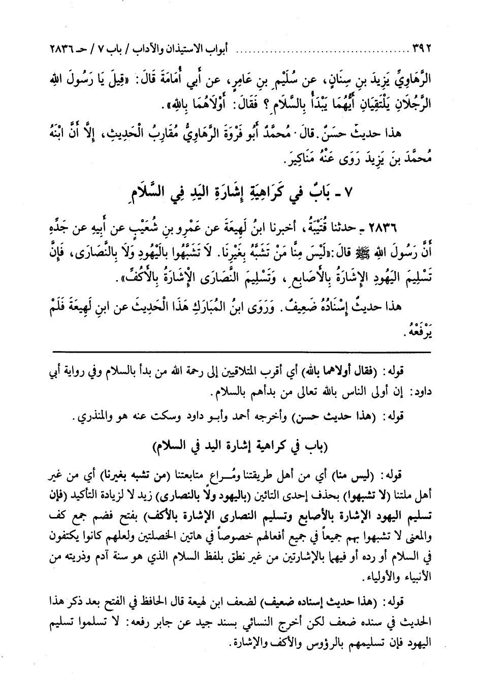 (بَاب مَا جَاءَ فِي كَرَاهِيَةِ إِشَارَةِ الْيَدِ بِالسَّلَامِ)