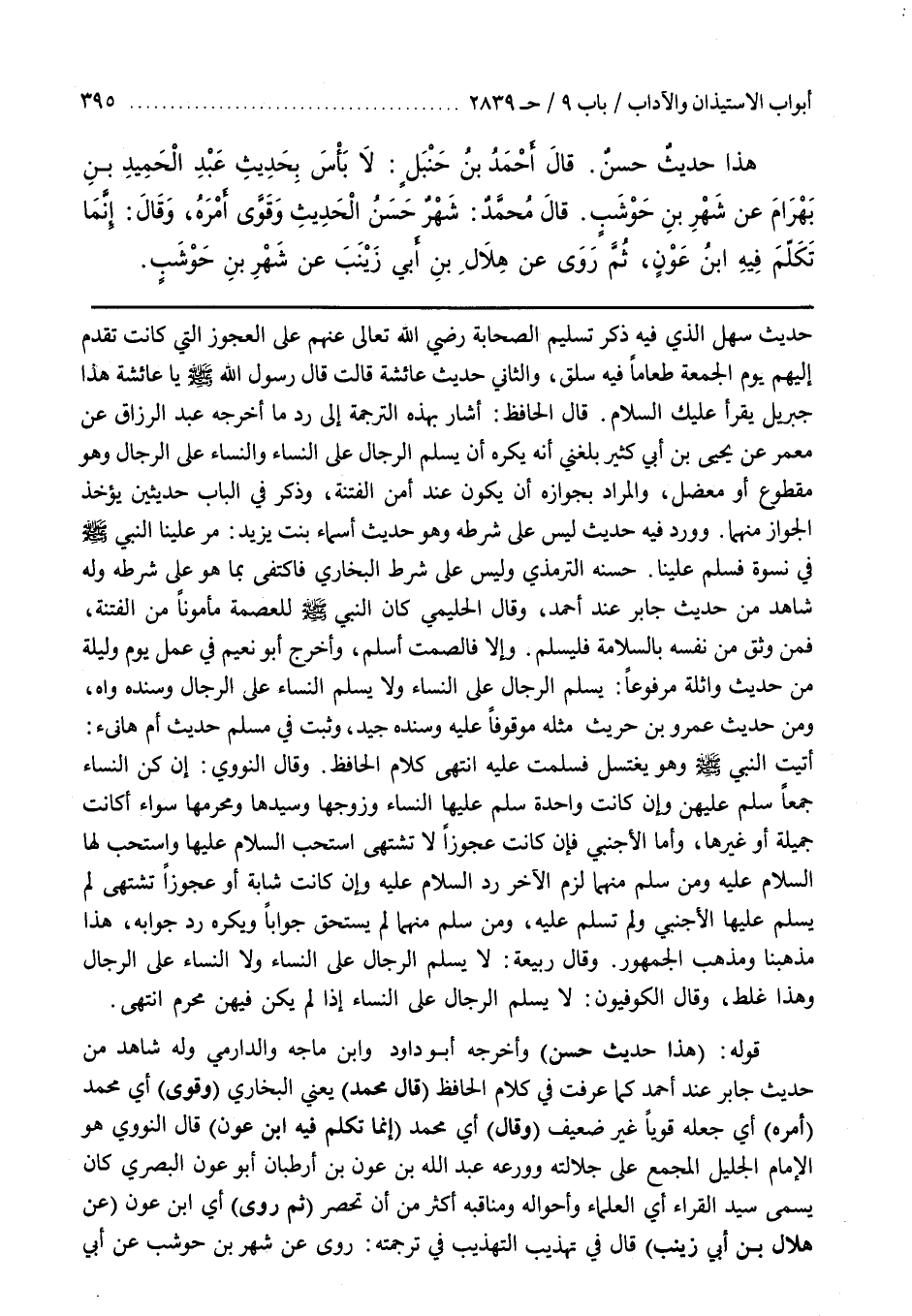 حَسَّنَهُ التِّرْمِذِيُّ وَلَيْسَ عَلَى شَرْطِ الْبُخَارِيِّ فَاكْتَفَى بِمَا هُوَ عَلَى شَرْطِهِ وَلَهُ شَاهِدٌ مِنْ حَدِيثِ جَابِرٍ عِنْدَ أَحْمَدَ وَقَالَ الْحَلِيمِيُّ كَانَ النَّبِيُّ صَلَّى اللَّهُ عَلَيْهِ وَسَلَّمَ لِلْعِصْمَةِ مَأْمُونًا مِنَ الْفِتْنَةِ فَمَنْ وَثِقَ مِنْ نَفْسِهِ بِالسَّلَامَةِ فَلْيُسَلِّمْ