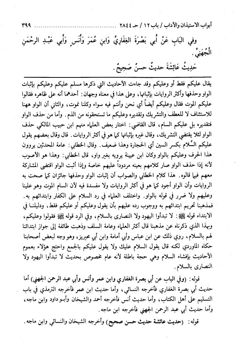 قَوْلُهُ (وَفِي الْبَابِ عن أبي بصرة الغفاري وبن عُمَرَ وَأَنَسٍ وَأَبِي عَبْدِ الرَّحْمَنِ الْجُهَنِيِّ) أَمَّا حَدِيثُ أَبِي بَصْرَةَ الْغِفَارِيِّ فَأَخْرَجَهُ النَّسَائِيُّ وَأَمَّا حديث بن عُمَرَ فَأَخْرَجَهُ التِّرْمِذِيُّ فِي بَابِ التَّسْلِيمِ عَلَى أَهْلِ الْكِتَابِ وَأَمَّا حَدِيثُ أَنَسٍ فَأَخْرَجَهُ أَحْمَدُ والشيخان وأبو داود وبن مَاجَهْ وَأَمَّا حَدِيثُ أَبِي عَبْدِ الرَّحْمَنِ الْجُهَنِيِّ فأخرجه بن مَاجَهْ