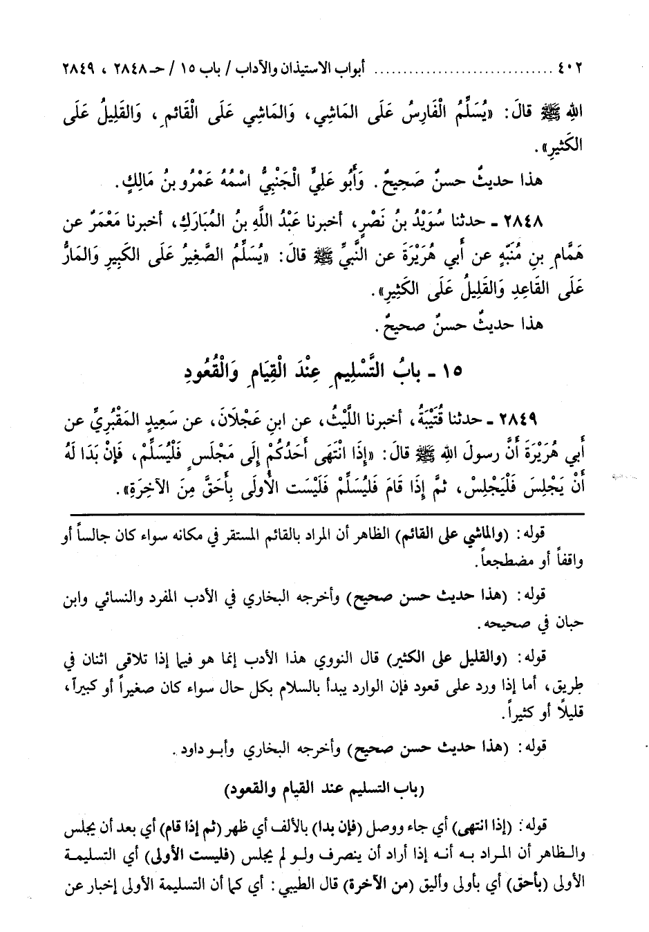 قَوْلُهُ (هَذَا حَدِيثٌ حَسَنٌ صَحِيحٌ) وَأَخْرَجَهُ الْبُخَارِيُّ فِي الْأَدَبِ الْمُفْرَدِ والنسائي وبن حبان في صحيحه قَوْلُهُ (وَالْقَلِيلُ عَلَى الْكَثِيرِ) قَالَ النَّوَوِيُّ هَذَا الْأَدَبُ إِنَّمَا هُوَ فِيمَا إِذَا تَلَاقَى اثْنَانِ فِي طَرِيقٍ أَمَّا إِذَا وَرَدَ عَلَى قُعُودٍ أو قاعد فإن لوارد يَبْدَأُ بِالسَّلَامِ بِكُلِّ حَالٍ سَوَاءٌ كَانَ صَغِيرًا أَوْ كَبِيرًا