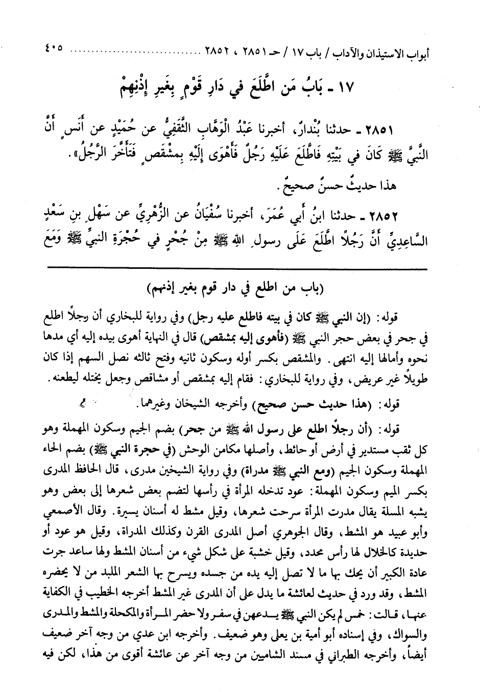 [2709] وله (أَنَّ النَّبِيَّ صَلَّى اللَّهُ عَلَيْهِ وَسَلَّمَ كَانَ فِي بَيْتِهِ فَاطَّلَعَ عَلَيْهِ رَجُلٌ) وَفِي رِوَايَةٍ لِلْبُخَارِيِّ أَنَّ رَجُلًا اطَّلَعَ فِي جُحْرٍ فِي بَعْضِ حُجَرِ النَّبِيِّ صَلَّى اللَّهُ عَلَيْهِ وَسَلَّمَ (فَأَهْوَى إِلَيْهِ بِمِشْقَصٍ) قَالَ فِي النِّهَايَةِ أَهْوَى بِيَدِهِ إِلَيْهِ أَيْ مَدَّهَا نَحْوَهُ وَأَمَالَهَا إِلَيْهِ انْتَهَى