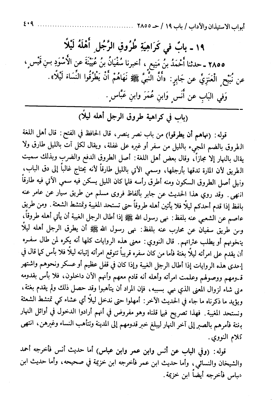 وَمِنْ طَرِيقِ عَاصِمٍ عَنِ الشَّعْبِيِّ عَنْهُ بِلَفْظِ نَهَى رَسُولُ اللَّهِ صَلَّى اللَّهُ عَلَيْهِ وسلم إذا أَطَالَ الرَّجُلُ الْغَيْبَةَ أَنْ يَأْتِيَ أَهْلَهُ طُرُوقًا وَمِنْ طَرِيقِ سُفْيَانَ عَنْ مُحَارِبٍ عَنْهُ بِلَفْظِ نَهَى رَسُولُ اللَّهِ صَلَّى اللَّهُ عَلَيْهِ وَسَلَّمَ أَنْ يَطْرُقَ الرَّجُلُ أَهْلَهُ لَيْلًا يَتَخَوَّنُهُمْ أَوْ يَطْلُبُ عَثَرَاتِهِمْ قَالَ النَّوَوِيُّ مَعْنَى هَذِهِ الرِّوَايَاتِ كُلِّهَا أَنَّهُ يُكْرَهُ لِمَنْ طَالَ سَفَرُهُ أَنْ يَقْدُمَ عَلَى امْرَأَتِهِ لَيْلًا بَغْتَةً فَأَمَّا مَنْ كَانَ سَفَرُهُ قَرِيبًا تَتَوَقَّعُ امْرَأَتُهُ إِتْيَانَهُ لَيْلًا فَلَا بَأْسَ كَمَا قَالَ فِي إِحْدَى هَذِهِ الرِّوَايَاتِ إِذَا أَطَالَ الرَّجُلُ الْغَيْبَةَ وَإِذَا كَانَ فِي قَفْلٍ عَظِيمٍ أَوْ عَسْكَرٍ وَنَحْوِهِمْ وَاشْتُهِرَ قُدُومُهُمْ وَوُصُولُهُمْ وَعَلِمَتِ امْرَأَتُهُ وَأَهْلُهُ أَنَّهُ قَادِمٌ مَعَهُمْ وَأَنَّهُمُ الْآنَ دَاخِلُونَ فَلَا بَأْسَ بِقُدُومِهِ مَتَى شَاءَ لِزَوَالِ الْمَعْنَى الَّذِي نُهِيَ بِسَبَبِهِ فَإِنَّ الْمُرَادَ أَنْ يَتَأَهَّبُوا وَقَدْ حَصَلَ ذَلِكَ وَلَمْ يَقْدُمْ بَغْتَةً وَيُؤَيِّدُ مَا ذَكَرْنَاهُ مَا جَاءَ فِي الْحَدِيثِ الْآخَرِ أَمْهِلُوا حَتَّى نَدْخُلَ لَيْلًا أَيْ عِشَاءً كَيْ تَمْتَشِطَ الشَّعِثَةُ وَتَسْتَحِدَّ الْمُغِيبَةُ فَهَذَا تَصْرِيحٌ فِيمَا قُلْنَاهُ وَهُوَ مَفْرُوضٌ فِي أَنَّهُمْ أَرَادُوا الدُّخُولَ فِي أَوَائِلِ النَّهَارِ بَغْتَةً فَأَمَرَهُمْ بِالصَّبْرِ إِلَى آخِرِ النَّهَارِ لِيَبْلُغَ خَبَرُ قُدُومِهِمْ إِلَى الْمَدِينَةِ وَتَتَأَهَّبُ النِّسَاءُ وَغَيْرُهُنَّ انْتَهَى كَلَامُ النَّوَوِيِّ