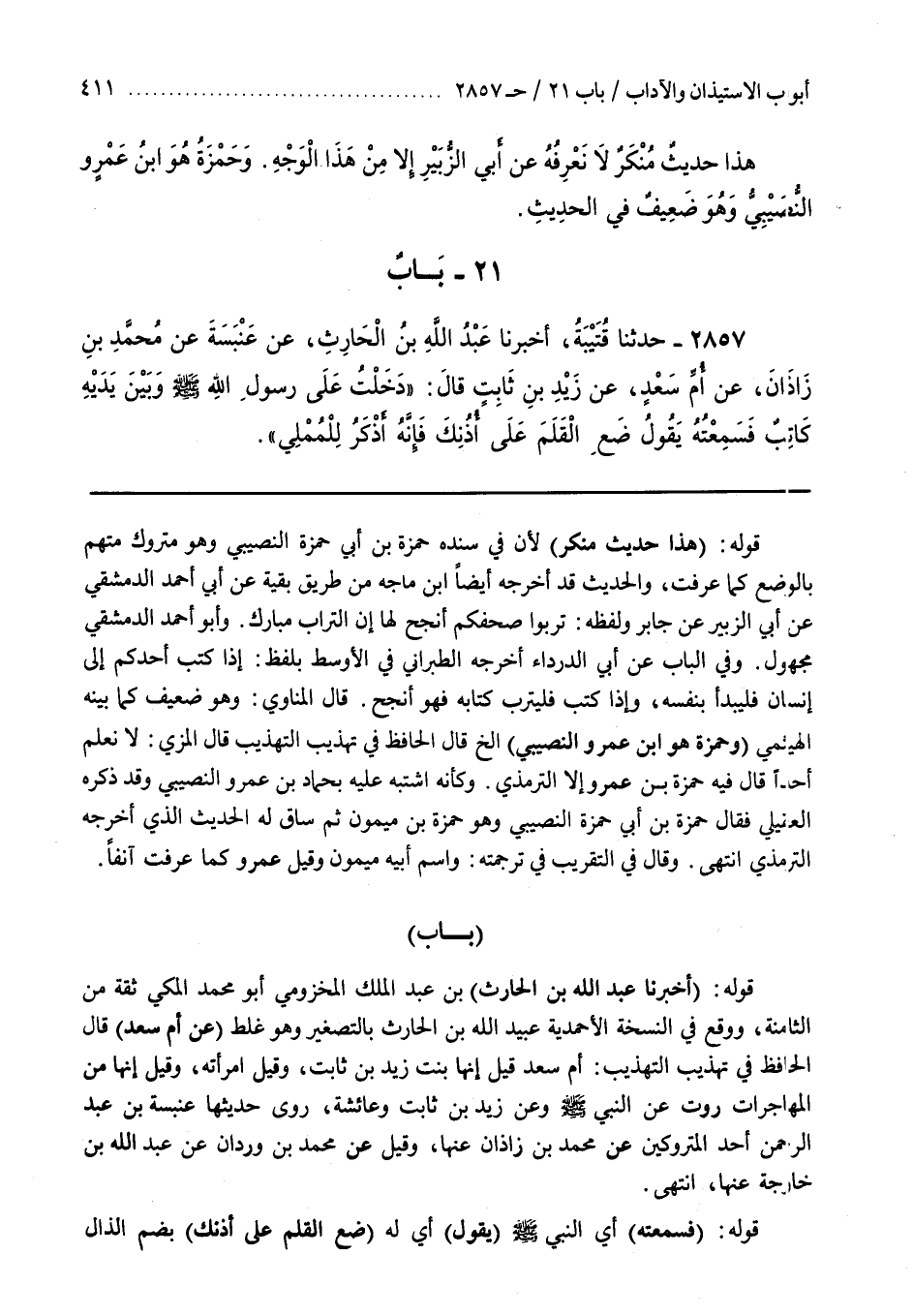 1 - باب [2714] قوله (حدثنا عَبْدُ اللَّهِ بْنُ الْحَارِثِ) بْنِ عَبْدِ الْمَلِكِ الْمَخْزُومِيُّ أَبُو مُحَمَّدٍ الْمَكِّيُّ ثِقَةٌ مِنَ الثَّامِنَةِ وَوَقَعَ فِي النُّسْخَةِ الْأَحْمَدِيَّةِ عُبَيْدُ اللَّهِ بْنُ الْحَارِثِ بِالتَّصْغِيرِ وَهُوَ غَلَطٌ (عَنْ أُمِّ سَعْدٍ) قَالَ الْحَافِظُ فِي تَهْذِيبِ التَّهْذِيبِ أُمُّ سَعْدٍ قِيلَ إِنَّهَا بِنْتُ زَيْدِ بْنِ ثَابِتٍ وَقِيلَ امْرَأَتُهُ وَقِيلَ إِنَّهَا مِنَ الْمُهَاجِرَاتِ رَوَتْ عَنْ النَّبِيِّ صَلَّى اللَّهُ عَلَيْهِ وَسَلَّمَ وَعَنْ زَيْدِ بْنِ ثَابِتٍ وَعَائِشَةَ رَوَى حَدِيثَهَا عَنْبَسَةُ بْنُ عَبْدِ الرَّحْمَنِ أَحَدُ الْمَتْرُوكِينَ عَنْ مُحَمَّدِ بْنِ زَاذَانَ عَنْهَا وَقِيلَ عَنْ مُحَمَّدِ بْنِ وَرْدَانَ عَنْ عَبْدِ اللَّهِ بْنِ خَارِجَةَ عَنْهَا انْتَهَى
