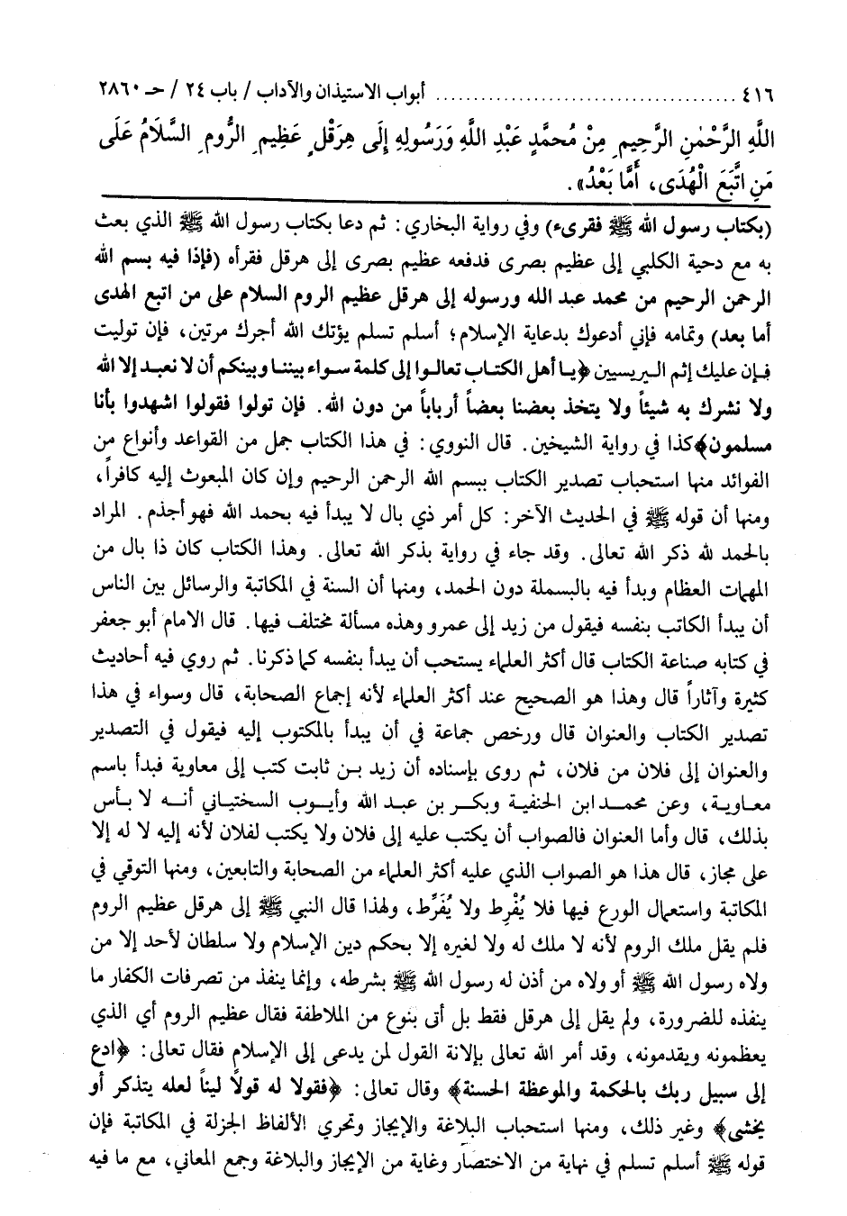 قَالَ النَّوَوِيُّ فِي هَذَا الْكِتَابِ جُمَلٌ مِنَ الْقَوَاعِدِ وَأَنْوَاعٌ مِنَ الفوائد منها استحباب الْكِتَابِ بِبَسْمِ اللَّهِ الرَّحْمَنِ الرَّحِيمِ وَإِنْ كَانَ الْمَبْعُوثُ إِلَيْهِ كَافِرًا وَمِنْهَا أَنَّ قَوْلَهُ صَلَّى اللَّهُ عَلَيْهِ وَسَلَّمَ فِي الْحَدِيثِ الْآخَرِ كُلُّ أَمْرٍ ذِي بَالٍ لَا يُبْدَأُ فِيهِ بِحَمْدِ اللَّهِ فَهُوَ أَجْزَمُ