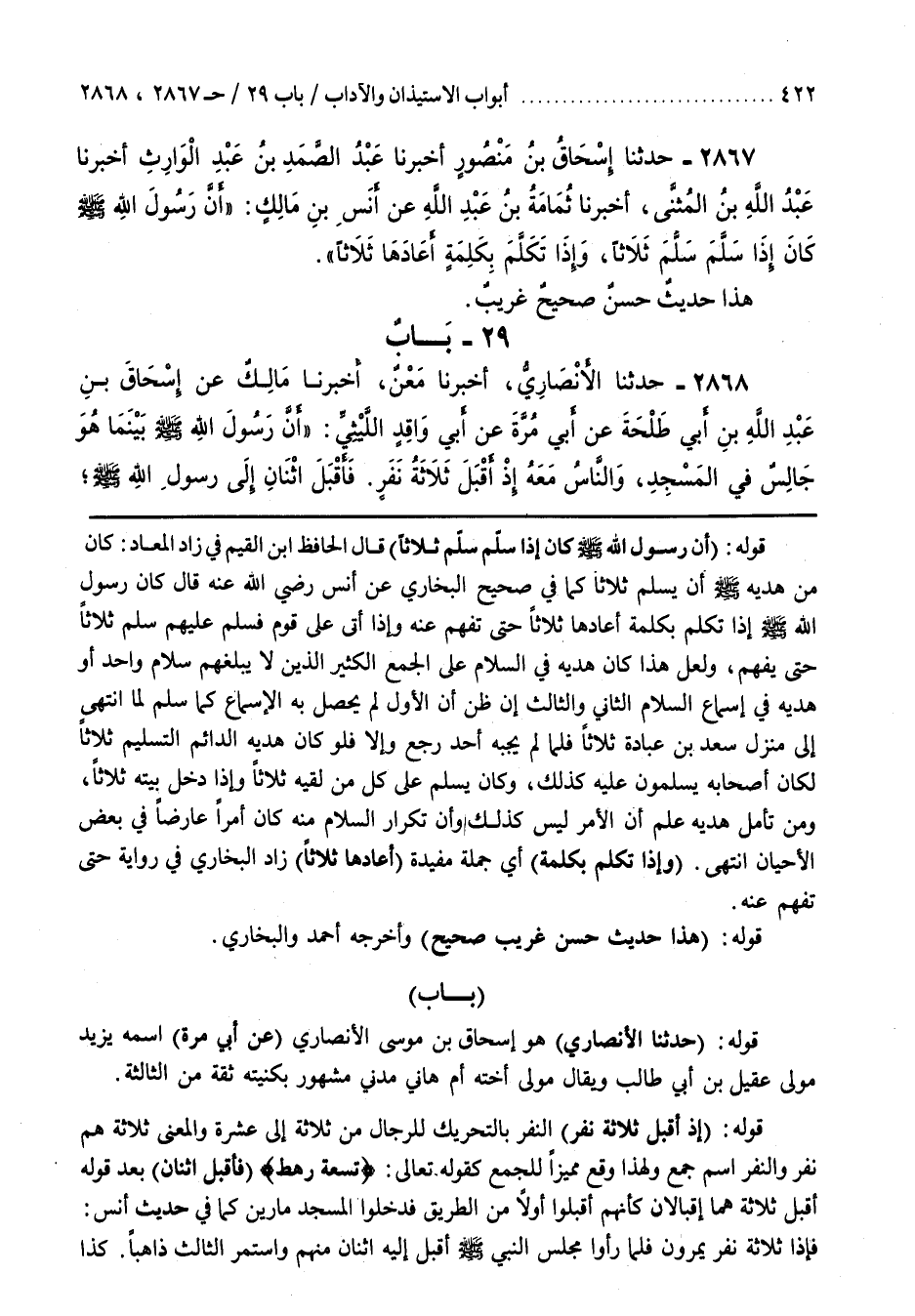 [2723] قَوْلُهُ (أَنَّ رَسُولَ اللَّهِ صَلَّى اللَّهُ عَلَيْهِ وَسَلَّمَ كَانَ إِذَا سَلَّمَ سَلَّمَ ثَلَاثًا) قَالَ الحافظ بن الْقَيِّمِ فِي زَادِ الْمَعَادِ كَانَ مِنْ هَدْيِهِ صَلَّى اللَّهُ عَلَيْهِ وَسَلَّمَ أَنَّ يُسَلِّمَ ثَلَاثًا كَمَا فِي صَحِيحِ الْبُخَارِيِّ عَنْ أَنَسٍ رَضِيَ اللَّهُ عَنْهُ قَالَ كَانَ رَسُولُ اللَّهِ صَلَّى اللَّهُ عَلَيْهِ وَسَلَّمَ إِذَا تَكَلَّمَ بِكَلِمَةٍ أَعَادَهَا ثَلَاثًا حَتَّى تُفْهَمَ عَنْهُ وَإِذَا أَتَى عَلَى قَوْمٍ فَسَلَّمَ عَلَيْهِمْ سَلَّمَ ثَلَاثًا حَتَّى يُفْهَمَ وَلَعَلَّ هَذَا كَانَ هَدْيَهُ فِي السَّلَامِ عَلَى الْجَمْعِ الْكَثِيرِ الَّذِينَ لَا يَبْلُغُهُمْ سَلَامٌ وَاحِدٌ أَوْ هَدْيَهُ فِي إِسْمَاعِ السَّلَامِ الثَّانِي وَالثَّالِثِ إِنْ ظَنَّ أَنَّ الْأَوَّلَ لَمْ يَحْصُلْ بِهِ الْإِسْمَاعُ كَمَا سَلَّمَ لَمَّا انْتَهَى إِلَى مَنْزِلِ سَعْدِ بْنِ عُبَادَةَ ثَلَاثًا فَلَمَّا لَمْ يُجِبْهُ أَحَدٌ رَجَعَ وَإِلَّا فَلَوْ كَانَ هَدْيُهُ الدَّائِمُ التَّسْلِيمَ ثَلَاثًا لَكَانَ أَصْحَابُهُ يُسَلِّمُونَ عَلَيْهِ كَذَلِكَ وَكَانَ يُسَلِّمُ عَلَى كُلِّ مَنْ لَقِيَهُ ثَلَاثًا وَإِذَا دَخَلَ بَيْتَهُ ثَلَاثًا وَمَنْ تَأَمَّلَ هَدْيَهُ عَلِمَ أَنَّ الْأَمْرَ لَيْسَ كَذَلِكَ وَأَنَّ تَكْرَارَ السَّلَامِ مِنْهُ كَانَ أَمْرًا عَارِضًا فِي بَعْضِ الْأَحْيَانِ انْتَهَى