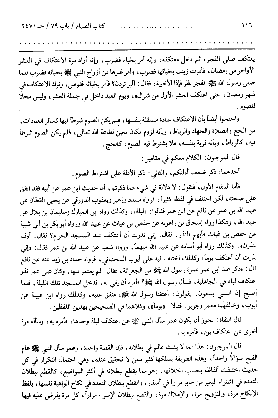 فَأَمَّا الْمَقَام الْأَوَّل فَنَقُول لَا دَلَالَة فِي شَيْءٍ مِمَّا ذَكَرْتُمْ أَمَّا حَدِيث بن عُمَر عَنْ أَبِيهِ فَقَدْ اُتُّفِقَ عَلَى صِحَّته لَكِنْ اُخْتُلِفَ فِي لَفْظه كَثِيرًا فَرَوَاهُ مُسَدَّد وَزُهَيْر وَيَعْقُوب الدَّوْرَقِيُ عَنْ يَحْيَى الْقَطَّان عَنْ عبيد الله بن عمر عن نافع عن بن عمر فقالوا ليلة وكذلك رواه بن الْمُبَارَك وَسُلَيْمَان بْن بِلَال عَنْ عُبَيْد اللَّه وَهَكَذَا رَوَاهُ إِسْحَاق بْن رَاهْوَيْهِ عَنْ حَفْص بْن غِيَاث عَنْ عُبَيْد اللَّه وَرَوَاهُ أَبُو بَكْر بْن أَبِي شَيْبَة عَنْ حَفْص بْن غياث فأبهم النذر فَقَالَ إِنِّي نَذَرْت أَنْ أَعْتَكِف عِنْد الْمَسْجِد الْحَرَام فَقَالَ أَوْفِ بِنَذْرِك وَكَذَلِكَ رَوَاهُ أَبُو أُسَامَة عَنْ عُبَيْد اللَّه مُبْهَمًا وَرَوَاهُ شُعْبَة عَنْ عُبَيْد اللَّه بْن عُمَر فَقَالَ إِنِّي نَذَرْت أَنْ أَعْتَكِف يَوْمًا وَكَذَلِكَ اُخْتُلِفَ فِيهِ عَلَى أَيُّوب السِّخْتِيَانِيّ فَرَوَاهُ حَمَّاد بْن زَيْد عنه عن نافع قال ذكر عند بن عُمَر عُمْرَة رَسُول اللَّه صَلَّى اللَّه عَلَيْهِ وَسَلَّمَ مِنْ الْجِعْرَانَة فَقَالَ لَمْ يَعْتَمِر مِنْهَا وَكَانَ عَلَى عُمَر نَذْر اِعْتِكَاف لَيْلَة فِي الْجَاهِلِيَّة فَسَأَلَ رَسُول اللَّه صَلَّى اللَّه عَلَيْهِ وَسَلَّمَ فَأَمَرَهُ أَنْ يَفِيَ بِهِ فَدَخَلَ الْمَسْجِد تِلْكَ اللَّيْلَة فَلَمَّا أَصْبَحَ إِذَا السَّبْيُ يَسْعَوْنَ يَقُولُونَ أَعْتَقَنَا رَسُول اللَّه صَلَّى اللَّه عَلَيْهِ وسلم متفق عليه وكذلك رواه بن عُيَيْنَة عَنْ أَيُّوب وَخَالَفَهُمَا مَعْمَر وَجَرِير فَقَالَا يَوْمًا وَكِلَاهُمَا فِي الصَّحِيحَيْنِ بِهَذَيْنِ اللَّفْظَيْنِ