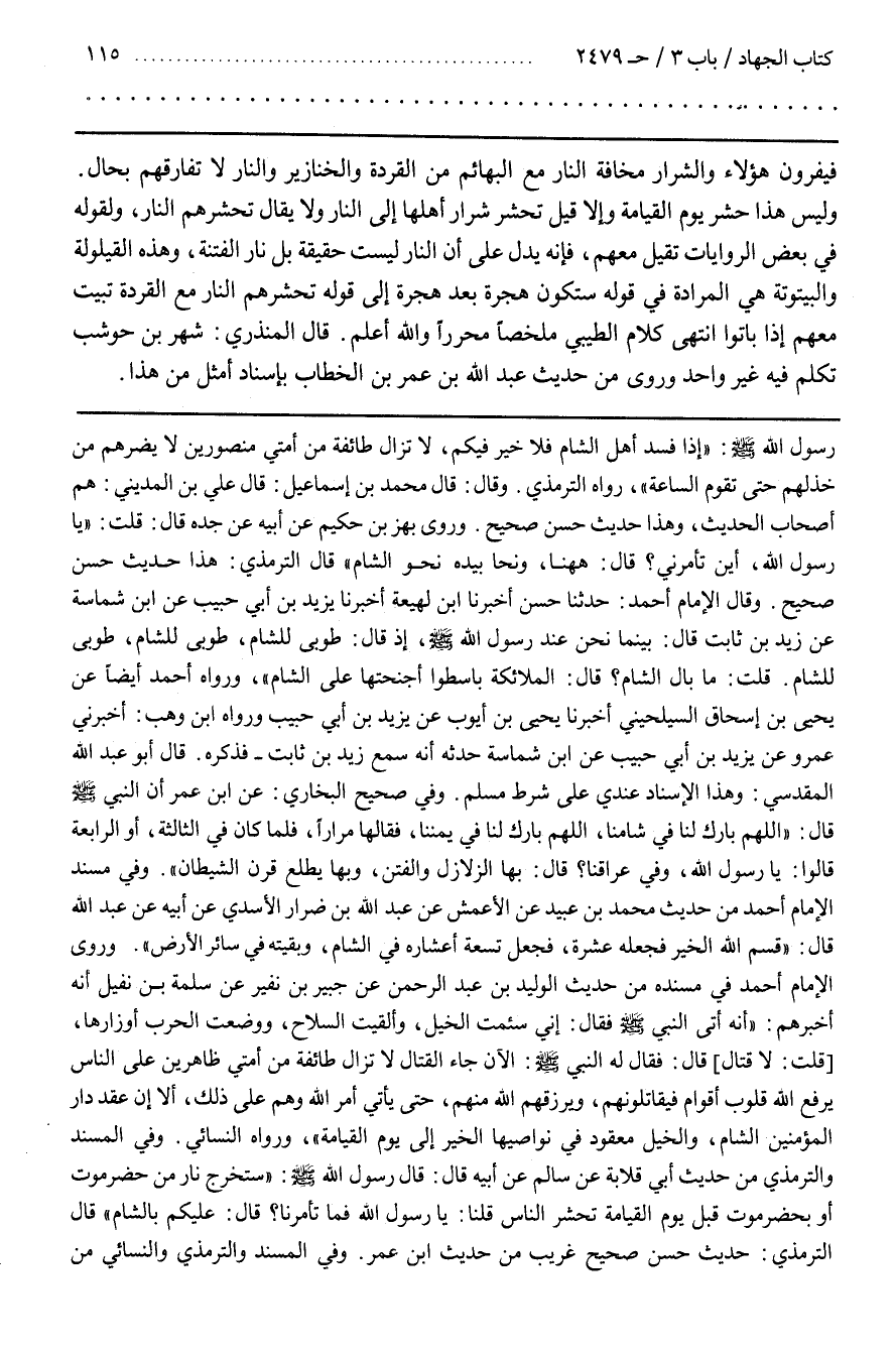 وَفِي صَحِيح البخاري عن بن عُمَر أَنَّ النَّبِيّ صَلَّى اللَّه عَلَيْهِ وَسَلَّمَ قَالَ اللَّهُمَّ بَارِكْ لَنَا فِي شَامِنَا اللَّهُمَّ بَارِكْ لَنَا فِي يَمَنِنَا فَقَالَهَا مِرَارًا فَلَمَّا كَانَ فِي الثَّالِثَة أَوْ الرَّابِعَة قَالُوا يَا رَسُول اللَّه وَفِي عِرَاقِنَا قَالَ بِهَا الزَّلَازِل وَالْفِتَن وَبِهَا يَطْلُع قَرْن الشَّيْطَان وَفِي مُسْنَد الْإِمَام أَحْمَد مِنْ حَدِيث مُحَمَّد بْن عُبَيْد عَنْ الْأَعْمَش عَنْ عَبْد اللَّه بْن ضِرَار الْأَسَدِيّ عَنْ أَبِيهِ عَنْ عَبْد اللَّه قَالَ قسم الله الخير فجعله عشرة فجعل تِسْعَة أَعْشَاره فِي الشَّام وَبَقِيَّته فِي سَائِر الْأَرْض وَرَوَى الْإِمَام أَحْمَد فِي مُسْنَده مِنْ حَدِيث الْوَلِيد بْن عَبْد الرَّحْمَن عَنْ جُبَيْر بْن نُفَيْر عَنْ سَلَمَة بْن نَفِيل أَنَّهُ أَخْبَرَهُمْ أَنَّهُ أَتَى النَّبِيّ صَلَّى اللَّه عَلَيْهِ وَسَلَّمَ فَقَالَ إِنِّي سَئِمْت الْخَيْل وَأَلْقَيْت السِّلَاح وَوَضَعَتْ الْحَرْب أَوْزَارهَا (قُلْت لَا قِتَال) قَالَ فقال له النبي صلى الله عليه وسلم الْآن جَاءَ الْقِتَال لَا تزال طَائِفَة مِنْ أُمَّتِي ظَاهِرِينَ عَلَى النَّاس يَرْفَع اللَّه قُلُوب أقوام فيقاتلونهم ويرزقهم الله مِنْهُمْ حَتَّى يَأْتِي أَمْر اللَّه وَهُمْ عَلَى ذلك ألا إن عقد دَار الْمُؤْمِنِينَ الشَّام وَالْخَيْل مَعْقُود فِي نَوَاصِيهَا الْخَيْر إِلَى يَوْم الْقِيَامَة وَرَوَاهُ النَّسَائِيُّ وَفِي الْمُسْنَد وَالتِّرْمِذِيّ مِنْ حَدِيث أَبِي قِلَابَةَ عَنْ سَالِم عَنْ أَبِيهِ قَالَ قَالَ رَسُول اللَّه صَلَّى اللَّه عَلَيْهِ وَسَلَّمَ سَتَخْرُجُ نَار مِنْ حَضْرَمَوْت أَوْ بِحَضْرَمَوْت قَبْل يَوْم الْقِيَامَة تَحْشُر النَّاس قُلْنَا يَا رَسُول اللَّه فَمَا تَأْمُرنَا قَالَ عَلَيْكُمْ بِالشَّامِ قَالَ التِّرْمِذِيّ حَدِيث حَسَن صحيح غريب من حديث بن عُمَر