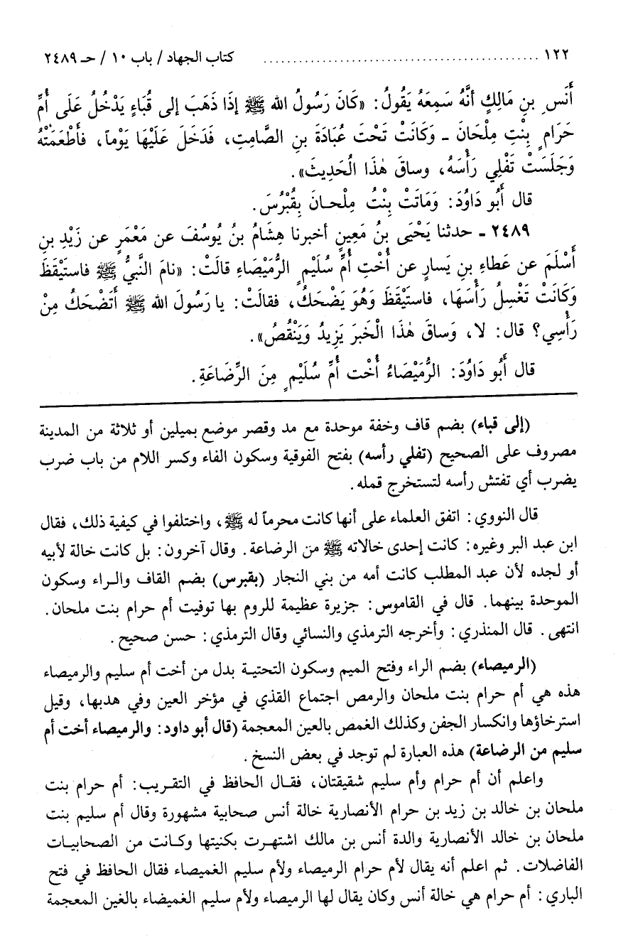 وَاعْلَمْ أَنَّ أُمَّ حَرَامٍ وَأُمَّ سُلَيْمٍ شَقِيقَتَانِ فَقَالَ الْحَافِظُ فِي التَّقْرِيبِ أُمُّ حَرَامٍ بِنْتُ مِلْحَانَ بْنِ خَالِدِ بْنِ زَيْدِ بْنِ حَرَامٍ الْأَنْصَارِيَّةُ خَالَةُ أَنَسٍ صَحَابِيَّةٌ مَشْهُورَةٌ