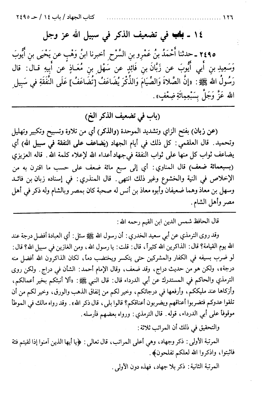 ــــــــــــQقال الحافظ شمس الدين بن القيم رحمه اللَّه وَقَدْ رَوَى التِّرْمِذِيّ عَنْ أَبِي سَعِيد الخدري أن رسول الله صلى الله عليه وَسَلَّمَ سُئِلَ أَيّ الْعِبَادَة أَفْضَل دَرَجَة عِنْد اللَّه يَوْم الْقِيَامَة قَالَ الذَّاكِرِينَ اللَّه كَثِيرًا قَالَ قُلْت يَا رَسُول اللَّه وَمِنْ الْغَازِينَ فِي سَبِيل اللَّه قَالَ لَوْ ضَرَبَ بِسَيْفِهِ فِي الْكُفَّار وَالْمُشْرِكِينَ حَتَّى يَتَكَسَّر وَيَخْتَضِب دَمًا لَكَانَ الذَّاكِرُونَ اللَّه أَفْضَل مِنْهُ دَرَجَة وَلَكِنْ هُوَ مِنْ حَدِيث دَرَّاج وَقَدْ ضُعِّفَ وَقَالَ الْإِمَام أَحْمَد الشَّأْن فِي دَرَّاج