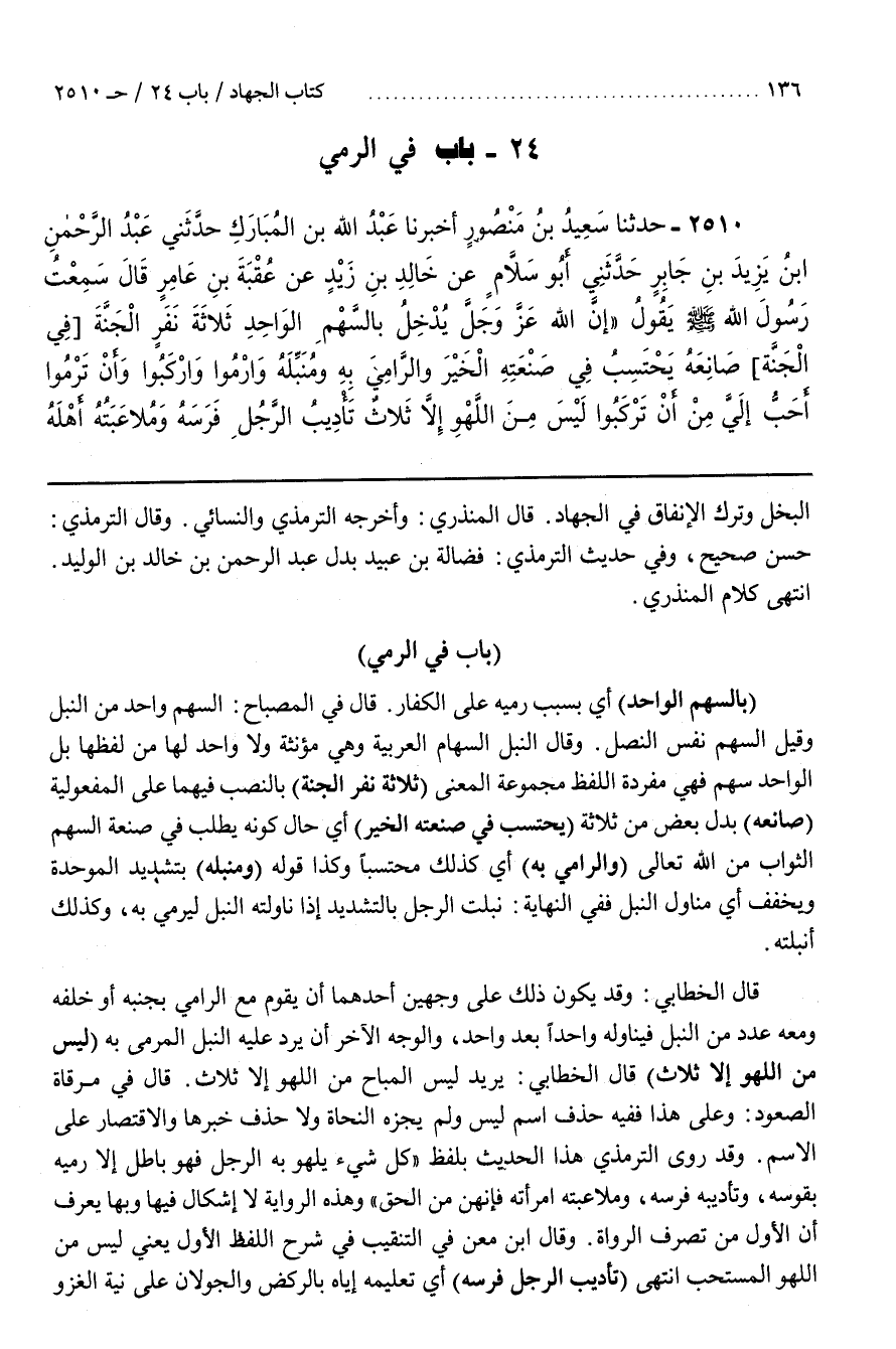 وَقَدْ رَوَى التِّرْمِذِيُّ هَذَا الْحَدِيثَ بِلَفْظِ كُلُّ شَيْءٍ يَلْهُو بِهِ الرَّجُلُ فَهُوَ بَاطِلٌ إِلَّا رَمْيَهُ بِقَوْسِهِ وَتَأْدِيبَهُ فَرَسَهُ وَمُلَاعَبَتَهُ امْرَأَتَهُ فَإِنَّهُنَّ مِنَ الْحَقِّ وَهَذِهِ الرِّوَايَةُ لَا إِشْكَالَ فِيهَا وَبِهَا يُعْرَفُ أَنَّ الْأَوَّلَ مِنْ تصرف الرواة