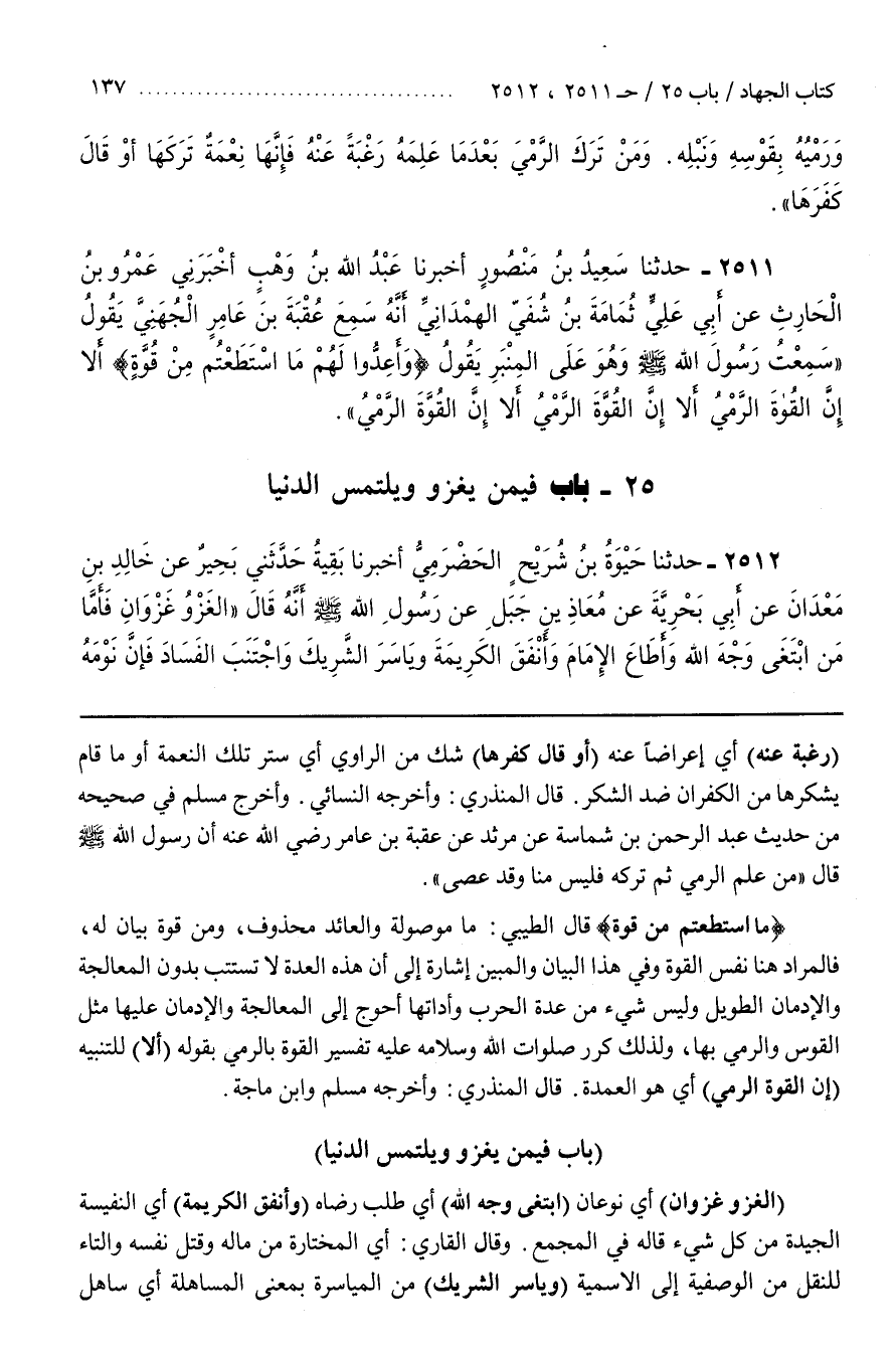 وَأَخْرَجَ مُسْلِمٌ فِي صَحِيحِهِ مِنْ حَدِيثِ عَبْدِ الرَّحْمَنِ بْنِ شِمَاسَةَ عَنْ مَرْثَدٍ عَنْ عُقْبَةَ بْنِ عَامِرٍ رَضِيَ اللَّهُ عَنْهُ أَنَّ رَسُولَ اللَّهِ صَلَّى اللَّهُ عَلَيْهِ وَسَلَّمَ قَالَ مَنْ عَلِمَ الرَّمْيَ ثُمَّ تَرَكَهُ فَلَيْسَ مِنَّا وَقَدْ عَصَى