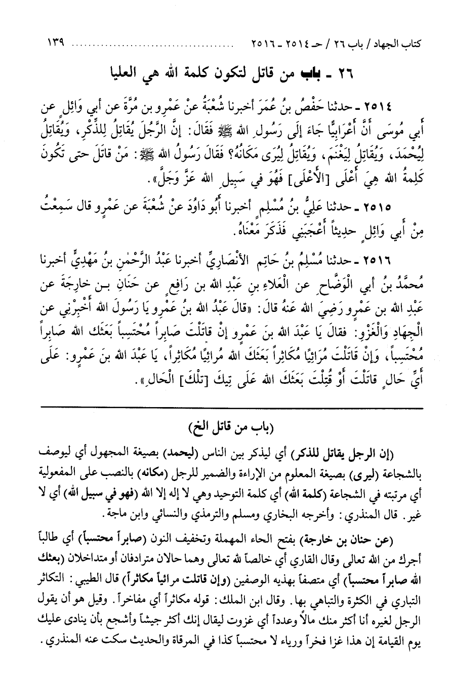 [2517] أَيْ لِيُذْكَرَ بَيْنَ النَّاسِ (لِيُحْمَدَ) بِصِيغَةِ الْمَجْهُولِ أَيْ لِيُوصَفَ بِالشُّجَاعَةِ (لِيَرَى) بِصِيغَةِ الْمَعْلُومِ مِنَ الْإِرَاءَةِ وَالضَّمِيرُ لِلرَّجُلِ (مَكَانَهُ) بِالنَّصْبِ عَلَى الْمَفْعُولِيَّةِ أَيْ مَرْتَبَتَهُ فِي الشُّجَاعَةِ (كَلِمَةُ اللَّهِ) أَيْ كَلِمَةَ التَّوْحِيدِ وَهِيَ لَا إِلَهَ إِلَّا اللَّهُ (فَهُوَ فِي سَبِيلِ اللَّهِ) أَيْ لَا غَيْرُ