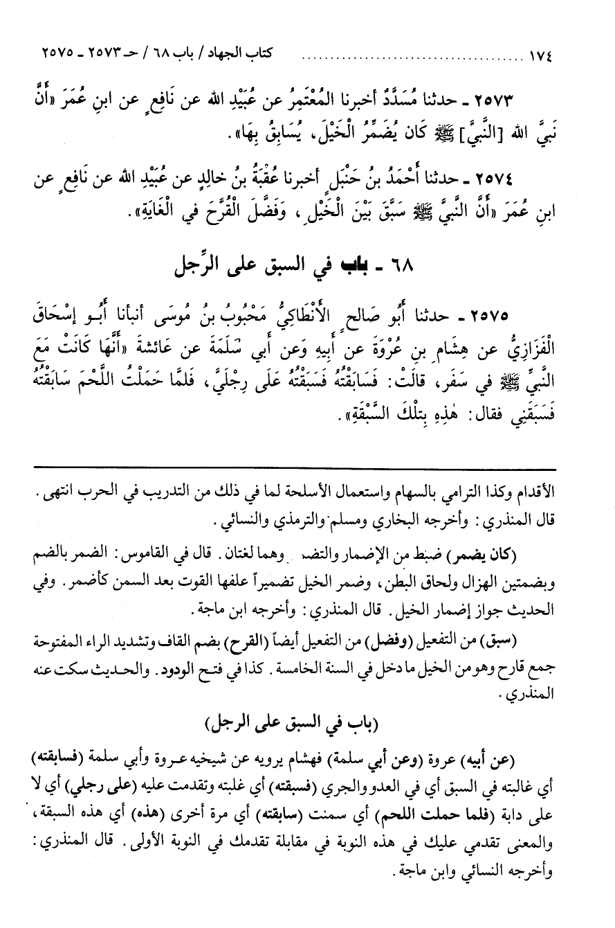 [2578] (عَنْ أَبِيهِ) عُرْوَةَ (وَعَنْ أَبِي سَلَمَةَ) فَهِشَامٌ يَرْوِيهِ عَنْ شَيْخَيْهِ عُرْوَةَ وَأَبِي سَلَمَةَ (فَسَابَقْتُهُ) أَيْ غَالَبْتُهُ فِي السَّبْقِ أَيْ فِي الْعَدْوِ وَالْجَرْيِ (فَسَبَقْتُهُ) أَيْ غَلَبْتُهُ وَتَقَدَّمْتُ عَلَيْهِ (عَلَى رِجْلِي) أَيْ لَا عَلَى دَابَّةٍ (فَلَمَّا حَمَلْتُ اللَّحْمَ) أَيْ سَمِنْتُ (سَابَقْتُهُ) أَيْ مَرَّةً أُخْرَى (هَذِهِ) أَيْ هَذِهِ السِّبْقَةُ وَالْمَعْنَى تَقَدُّمِي عَلَيْكِ فِي هَذِهِ النَّوْبَةِ فِي مُقَابَلَةِ تَقَدُّمِكِ فِي النَّوْبَةِ الْأُولَى