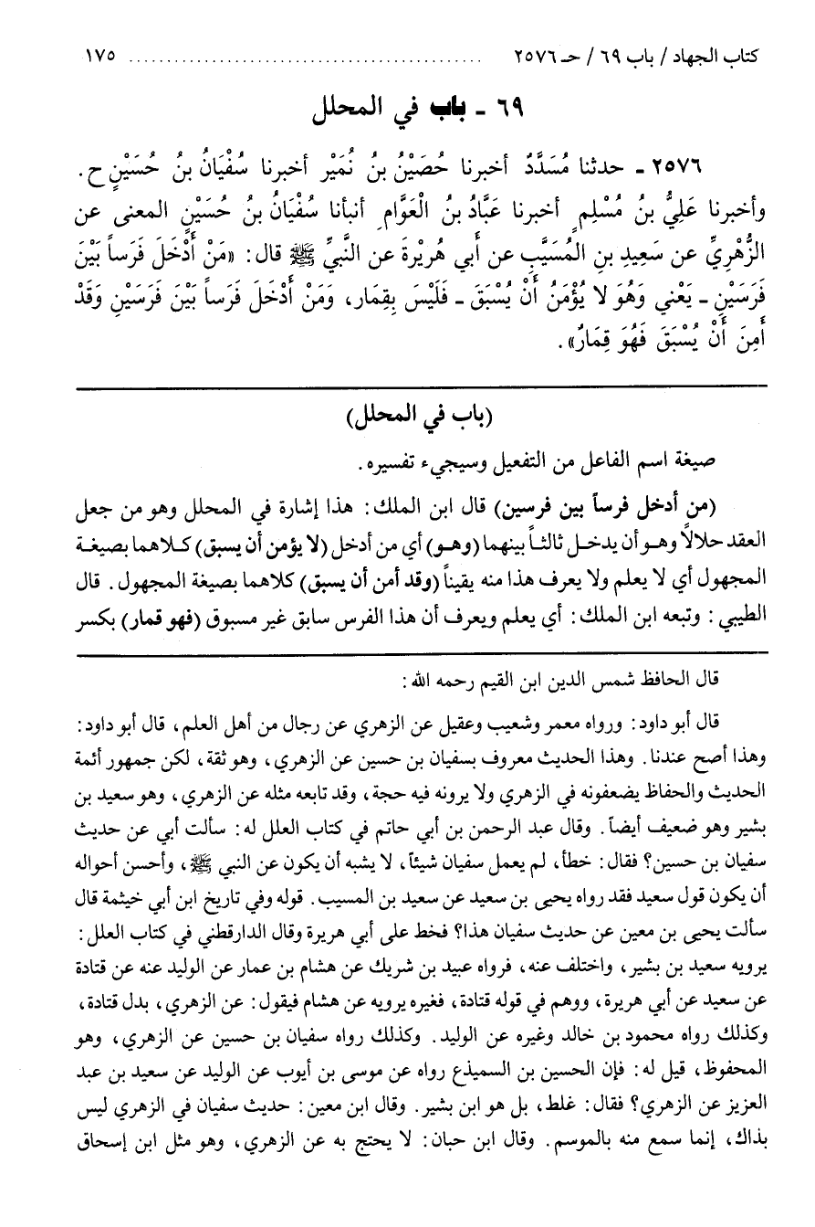 (مَنْ أَدْخَلَ فَرَسًا بَيْنَ فرسين) قال بن الْمَلَكِ هَذَا إِشَارَةٌ فِي الْمُحَلِّلِ وَهُوَ مِنْ جَعْلِ الْعَقْدِ حَلَالًا وَهُوَ أَنْ يُدْخِلَ ثَالِثًا بَيْنَهُمَا (وَهُوَ) أَيْ مَنْ أُدْخِلَ (لَا يُؤْمَنُ أَنْ يُسْبَقَ) كِلَاهُمَا بِصِيغَةِ الْمَجْهُولِ أَيْ لَا يُعْلَمُ وَلَا يُعْرَفُ هَذَا مِنْهُ يَقِينًا (وَقَدْ أُمِنَ أَنْ يُسْبَقَ) كِلَاهُمَا بِصِيغَةِ الْمَجْهُولِ
