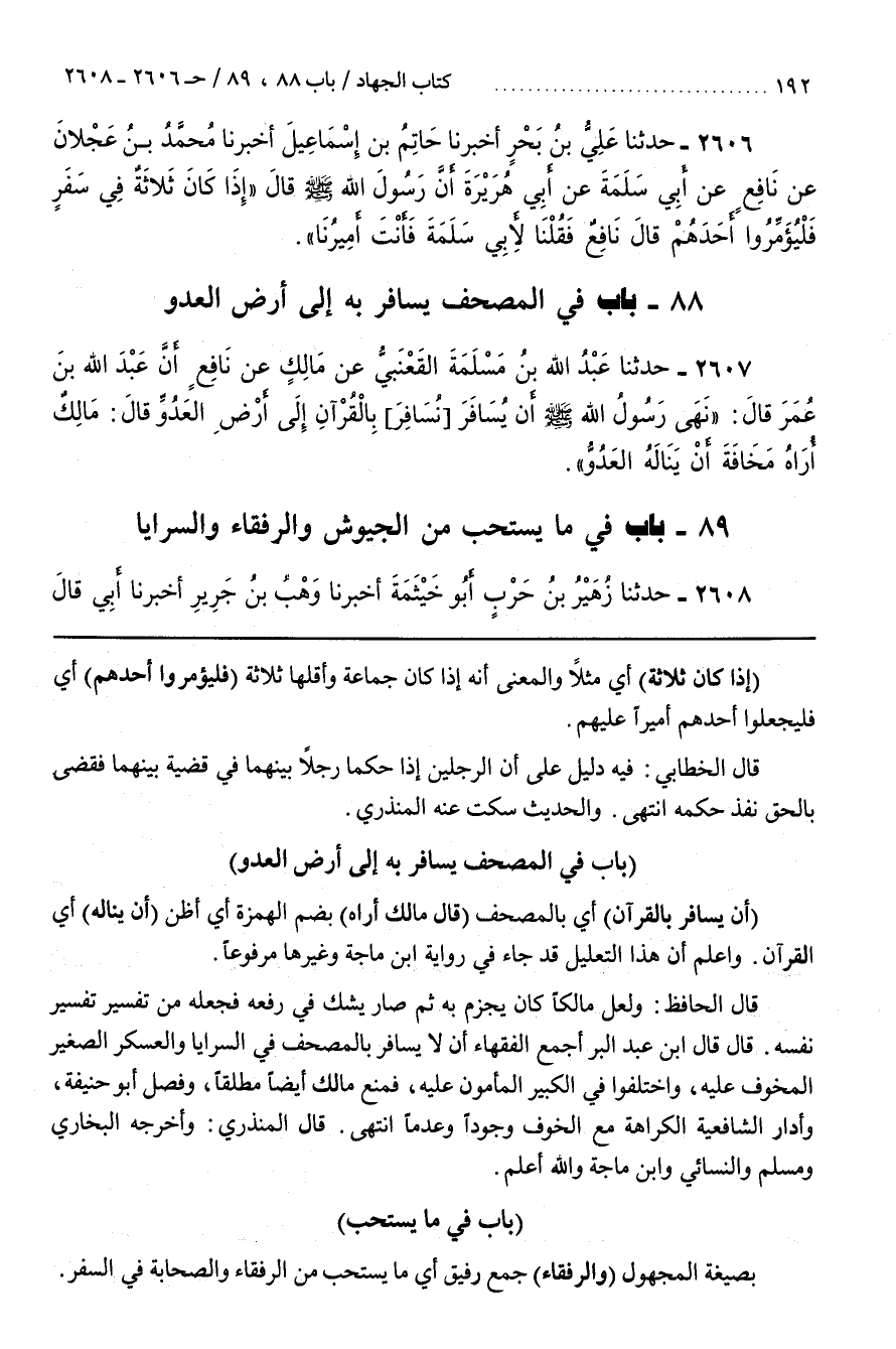 قَالَ قَالَ بن عَبْدِ الْبَرِّ أَجْمَعَ الْفُقَهَاءُ أَنْ لَا يُسَافِرَ بِالْمُصْحَفِ فِي السَّرَايَا وَالْعَسْكَرِ الصَّغِيرُ الْمَخُوفُ عَلَيْهِ وَاخْتَلَفُوا فِي الْكَبِيرِ الْمَأْمُونِ عَلَيْهِ فَمَنَعَ مَالِكٌ أَيْضًا مُطْلَقًا وَفَصَّلَ أَبُو حَنِيفَةَ وَأَدَارَ الشَّافِعِيَّةُ الْكَرَاهَةَ مَعَ الْخَوْفِ وُجُودًا وَعَدَمًا انْتَهَى