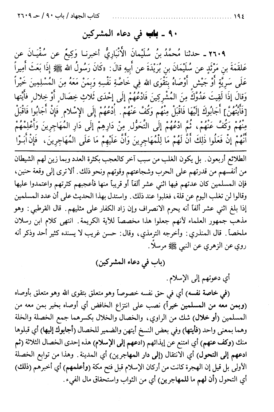 (فِي خَاصَّةِ نَفْسِهِ) أَيْ فِي حَقِّ نَفْسِهِ خُصُوصًا وَهُوَ مُتَعَلِّقٌ بِتَقْوَى اللَّهِ وَهُوَ مُتَعَلِّقٌ بِأَوْصَاهُ (وَبِمَنْ مَعَهُ مِنَ الْمُسْلِمِينَ خَيْرًا) نُصِبَ عَلَى انْتِزَاعِ الْخَافِضِ أَيْ أَوْصَاهُ بِخَيْرٍ بِمَنْ مَعَهُ مِنَ الْمُسْلِمِينَ (أَوْ خِلَالٍ) شَكٌّ مِنَ الرَّاوِي وَالْخِصَالُ وَالْخِلَالُ بِكَسْرِهِمَا جَمْعُ الْخَصْلَةِ وَالْخَلَّةِ وَهُمَا بِمَعْنًى وَاحِدٍ (فَأَيَّتُهَا) وَفِي بَعْضِ النُّسَخِ أَيَّتُهُنَّ وَالضَّمِيرُ لِلْخِصَالِ (أَجَابُوكَ إِلَيْهَا) أَيْ قَبِلُوهَا مِنْكَ (وَكُفَّ عَنْهُمْ) أَيِ امْتَنِعْ عَنْ إِيذَائِهِمْ (ادْعُهُمْ إِلَى الْإِسْلَامِ) هَذِهِ إِحْدَى الْخِصَالِ الثَّلَاثِ (ثُمَّ ادْعُهُمْ إِلَى التَّحَوُّلِ) أَيِ الِانْتِقَالِ (إِلَى دَارِ الْمُهَاجِرِينَ) أَيَ الْمَدِينَةِ وَهَذَا مِنْ تَوَابِعِ الْخَصْلَةِ الْأُولَى بَلْ قِيلَ إِنَّ الْهِجْرَةَ كَانَتْ مِنْ أَرْكَانِ الْإِسْلَامِ قَبْلَ فَتْحِ مَكَّةَ (وَأَعْلِمْهُمْ) أَيْ أَخْبِرْهُمْ (ذَلِكَ) أَيِ التَّحَوُّلَ (أَنَّ لَهُمْ مَا لِلْمُهَاجِرِينَ) أَيْ مِنَ الثَّوَابِ وَاسْتِحْقَاقِ مَالِ الْفَيْءِ