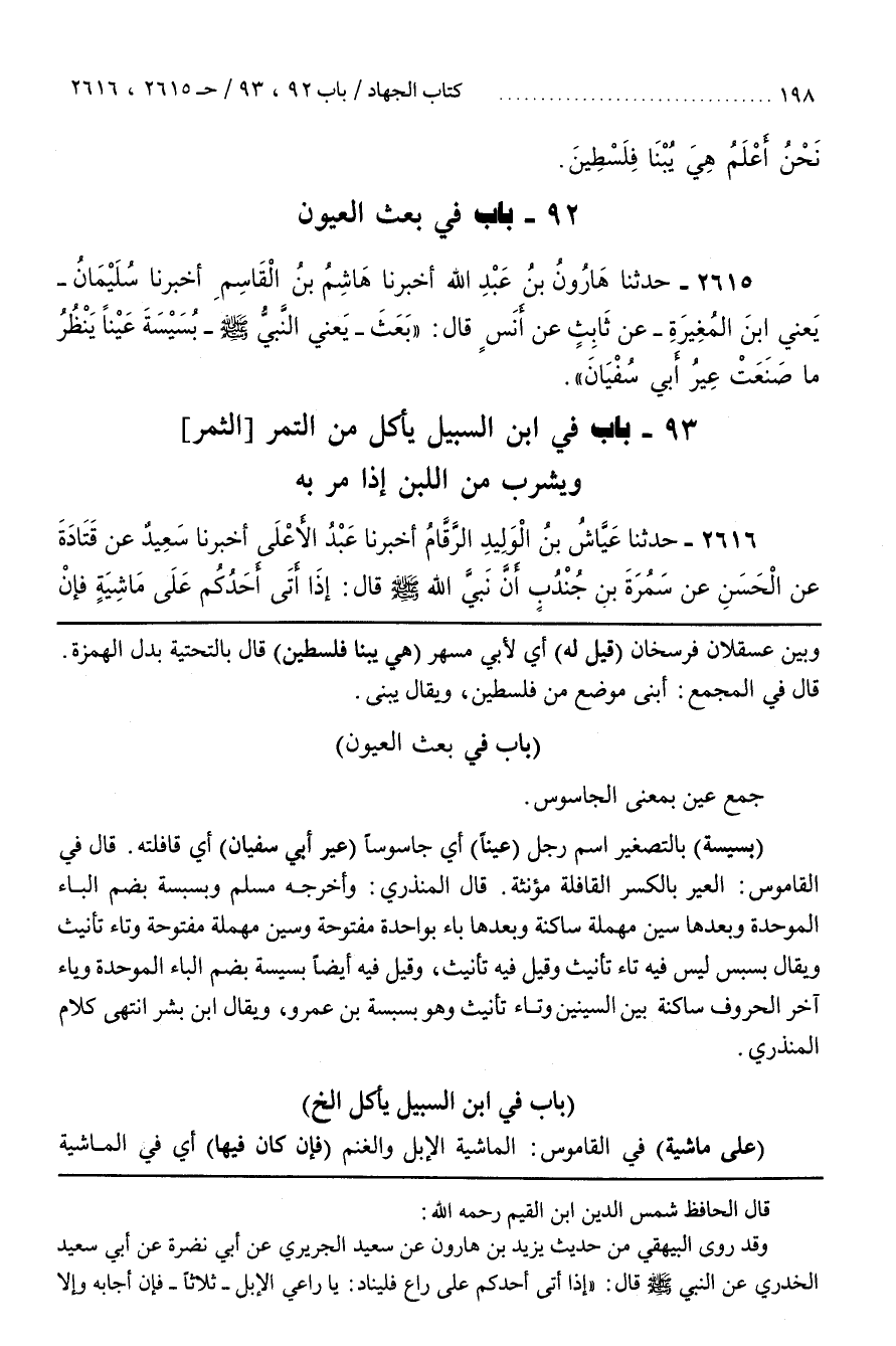 [2618] جَمْعُ عَيْنٍ بِمَعْنَى الْجَاسُوسِ (بُسَيْسَةَ) بِالتَّصْغِيرِ اسْمُ رَجُلٍ (عَيْنًا) أَيْ جَاسُوسًا (عِيرُ أَبِي سُفْيَانَ) أَيْ قَافِلَتُهُ