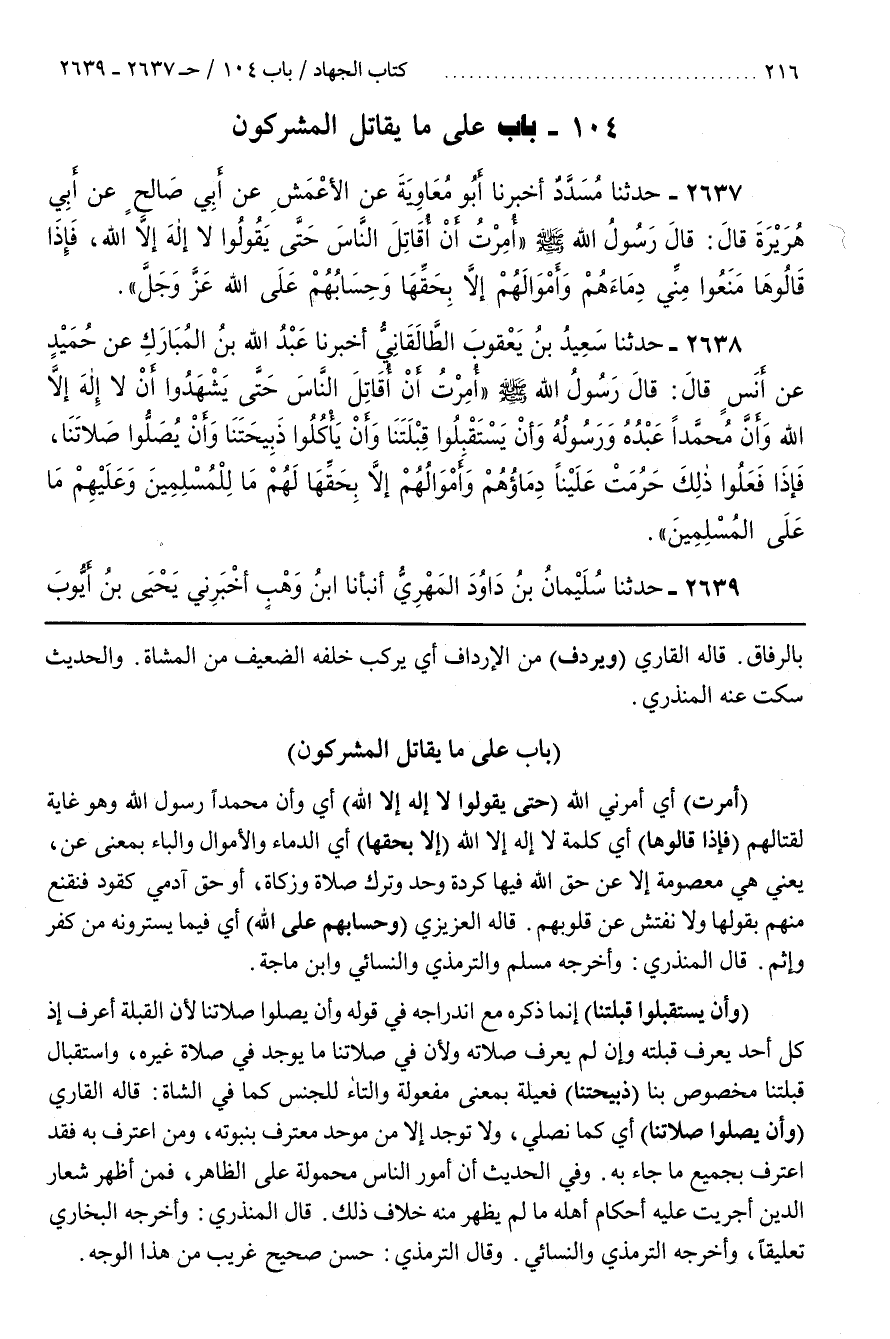 [2640] (أُمِرْتُ) أَيْ أَمَرَنِي اللَّهُ (حَتَّى يَقُولُوا لَا إِلَهَ إِلَّا اللَّهُ) أي وأن محمدا رسول الله وَهُوَ غَايَةٌ لِقِتَالِهِمْ (فَإِذَا قَالُوهَا) أَيْ كَلِمَةَ لَا إِلَهَ إِلَّا اللَّهُ (إِلَّا بِحَقِّهَا) أَيِ الدِّمَاءِ وَالْأَمْوَالِ وَالْبَاءُ بِمَعْنَى عَنْ يَعْنِي هِيَ مَعْصُومَةٌ إِلَّا عَنْ حَقِّ اللَّهِ فِيهَا كَرِدَّةٍ وَحَدٍّ وَتَرْكِ صَلَاةٍ وَزَكَاةٍ أَوْ حَقِّ آدَمِيٍّ كَقَوَدٍ فَنَقْنَعُ مِنْهُمْ بِقَوْلِهَا وَلَا نُفَتِّشُ عَنْ قُلُوبِهِمْ