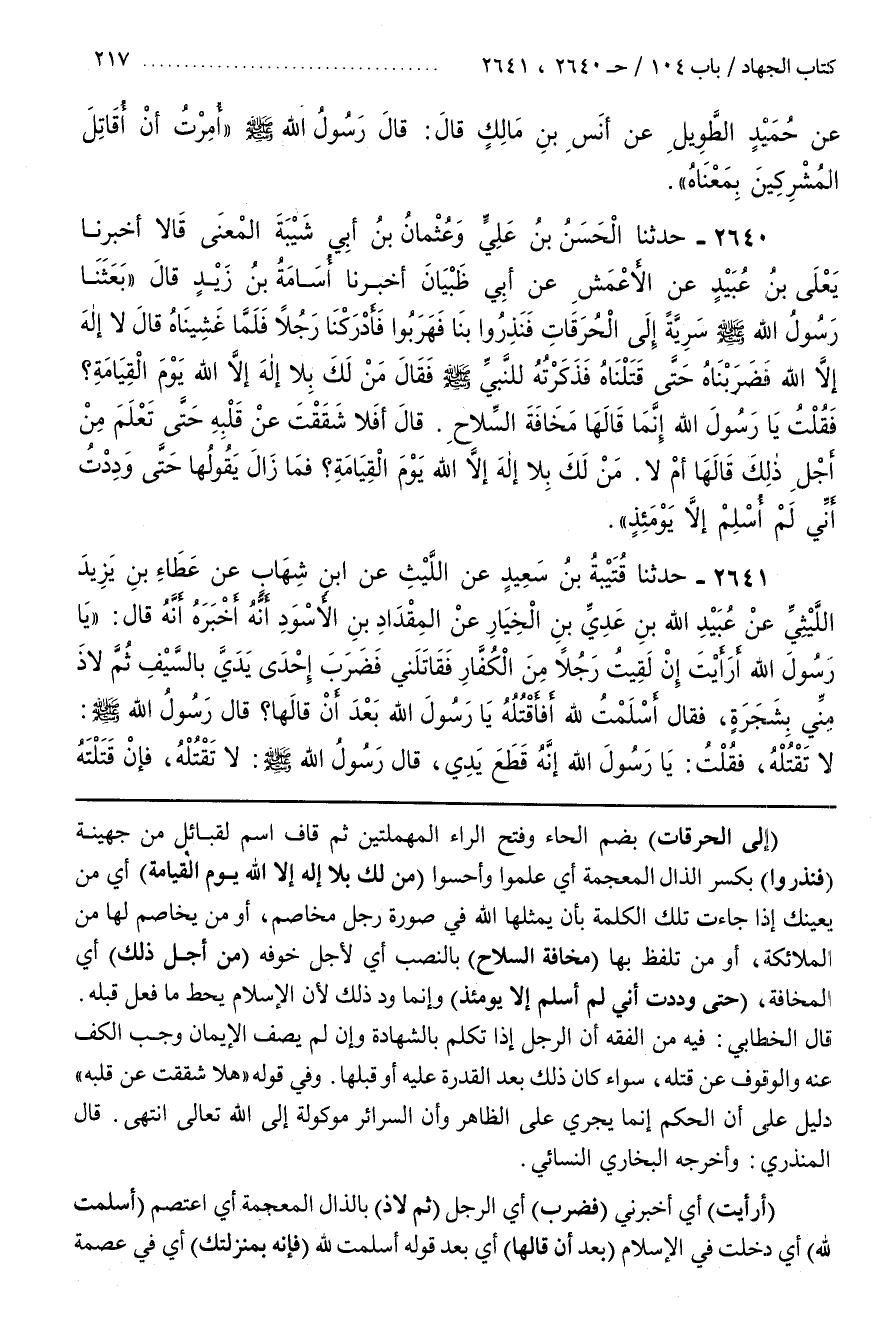 [2643] (إِلَى الْحُرَقَاتِ) بِضَمِّ الْحَاءِ وَفَتْحِ الرَّاءِ الْمُهْمَلَتَيْنِ ثُمَّ قَافٌ اسْمٌ لِقَبَائِلَ مِنْ جُهَيْنَةَ (فَنَذِرُوا) بِكَسْرِ الذَّالِ الْمُعْجَمَةِ أَيْ عَلِمُوا وَأَحَسُّوا (مَنْ لَكَ بِلَا إِلَهَ إِلَّا اللَّهُ يَوْمَ الْقِيَامَةِ) أَيْ مَنْ يُعِينُكَ إِذَا جَاءَتْ تِلْكَ الْكَلِمَةُ بِأَنَّ يُمَثِّلَهَا اللَّهُ فِي صُورَةِ رَجُلٍ مُخَاصِمٍ أَوْ مَنْ يُخَاصِمُ لَهَا مِنَ الْمَلَائِكَةِ أَوْ مَنْ تَلَفَّظَ بِهَا (مَخَافَةَ السِّلَاحِ) بِالنَّصْبِ أَيْ لِأَجْلِ خَوْفِهِ (مِنْ أَجْلِ ذَلِكَ) أَيِ الْمَخَافَةِ حتى وددت أني لم أسلم إلا يؤمئذ وَإِنَّمَا وَدَّ ذَلِكَ لِأَنَّ الْإِسْلَامَ يَحُطُّ مَا فُعِلَ قَبْلَهُ