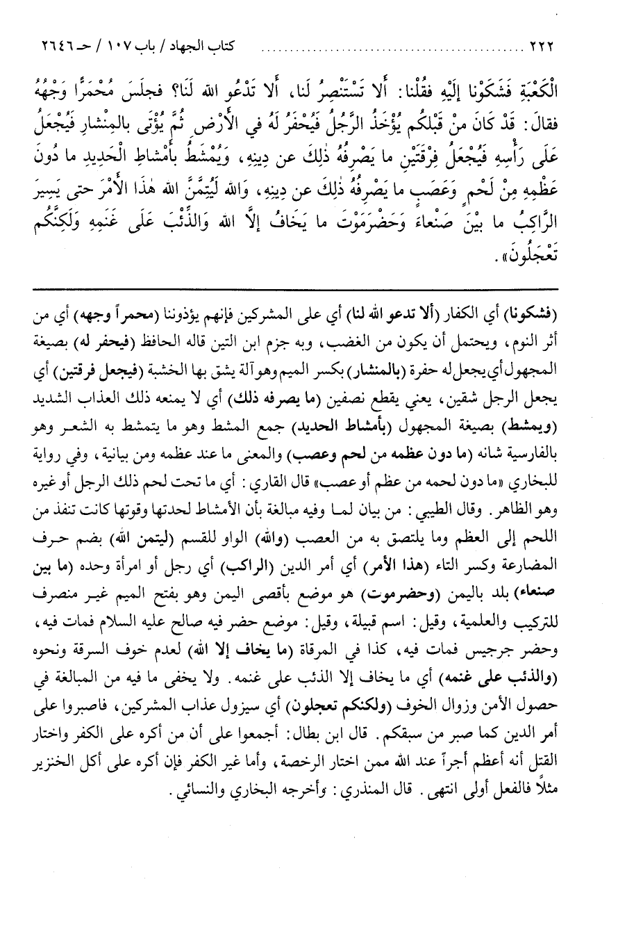 (فَشَكَوْنَا) أَيِ الْكُفَّارَ (أَلَا تَدْعُو اللَّهَ لَنَا) أَيْ عَلَى الْمُشْرِكِينَ فَإِنَّهُمْ يُؤْذُونَنَا (مُحْمَرًّا وَجْهُهُ) أَيْ مِنْ أَثَرِ النَّوْمِ وَيَحْتَمِلُ أَنْ يَكُونَ من الغضب وبه جزم بن التِّينِ قَالَهُ الْحَافِظُ (فَيُحْفَرُ لَهُ) بِصِيغَةِ الْمَجْهُولِ أَيْ يُجْعَلُ لَهُ حُفْرَةٌ (بِالْمِنْشَارِ) بِكَسْرِ الْمِيمِ هُوَ آلَةٌ يُشَقُّ بِهَا الْخَشَبَةُ (فَيُجْعَلُ فِرْقَتَيْنِ) أَيْ يُجْعَلُ الرَّجُلُ شِقَّيْنِ يَعْنِي يُقْطَعُ نِصْفَيْنِ (مَا يَصْرِفُهُ ذَلِكَ) أَيْ لَا يَمْنَعُهُ ذَلِكَ الْعَذَابُ الشَّدِيدُ (وَيُمْشَطُ) بِصِيغَةِ الْمَجْهُولِ (بِأَمْشَاطِ الْحَدِيدِ) جمع المشط وهو ما يتشط بِهِ الشَّعْرُ وَهُوَ بِالْفَارِسِيَّةِ شانه (مَا دُونَ عَظْمِهِ مِنْ لَحْمٍ وَعَصَبٍ) وَالْمَعْنَى مَا عِنْدَ عَظْمِهِ وَمِنْ بَيَانِيَّةٌ وَفِي رِوَايَةٍ لِلْبُخَارِيِّ مَا دُونَ لَحْمِهِ مِنْ عَظْمٍ أَوْ عَصَبٍ قَالَ القارىء أَيْ مَا تَحْتَ لَحْمِ ذَلِكَ الرَّجُلِ أَوْ غَيْرِهِ وَهُوَ الظَّاهِرُ