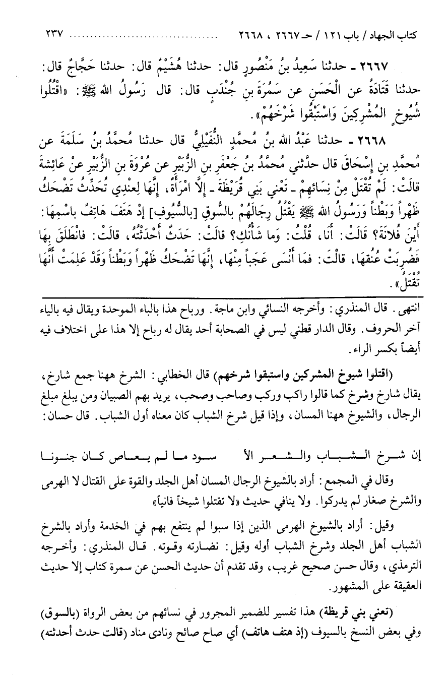 وَلَا يُنَافِي حَدِيثَ لَا تَقْتُلُوا شَيْخًا فَانِيًا وَقِيلَ أَرَادَ بِالشُّيُوخِ الْهَرْمَى الَّذِينَ إِذَا سُبُوا لَمْ يُنْتَفَعْ بِهِمْ فِي الْخِدْمَةِ وَأَرَادَ بِالشَّرْخِ الشَّبَابَ أَهْلَ الْجَلَدِ وَشَرْخُ الشَّبَابِ أَوَّلُهُ وَقِيلَ نَضَارَتُهُ وَقُوَّتُهُ