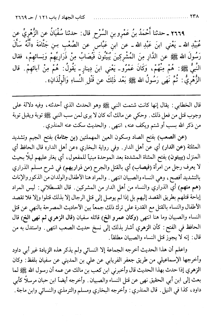 قَالَ الْقَسْطَلَّانِيُّ لَيْسَ الْمُرَادِ إِبَاحَةَ قَتْلِهِمْ بِطَرِيقِ الْقَصْدِ إِلَيْهِمْ بَلْ إِذَا لَمْ يُوصَلْ إِلَى قَتْلِ الرِّجَالِ إِلَّا بِذَلِكَ قُتِلُوا وَإِلَّا فَلَا تُقْصَدُ الْأَطْفَالُ وَالنِّسَاءُ بِالْقَتْلِ مَعَ الْقُدْرَةِ عَلَى تَرْكِ ذَلِكَ جَمْعًا بَيْنَ الْأَحَادِيثِ الْمُصَرِّحَةِ بِالنَّهْيِ عَنْ قَتْلِ النِّسَاءِ وَالصِّبْيَانِ وَمَا هُنَا انْتَهَى (وَكَانَ عَمْرٌو إِلَخْ) قَائِلُهُ سُفْيَانُ (قَالَ الزُّهْرِيُّ ثُمَّ نَهَى إِلَخْ) قَالَ الْحَافِظُ فِي الْفَتْحِ كَأَنَّ الزُّهْرِيُّ أَشَارَ بِذَلِكَ إِلَى نَسْخِ حَدِيثِ الصَّعْبِ انْتَهَى