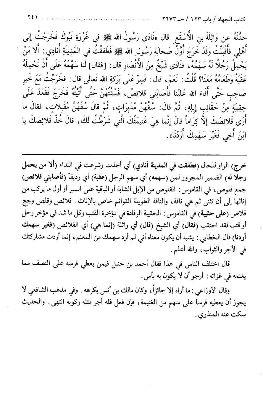 خَرَجَ) الْوَاوُ لِلْحَالِ (فَطَفِقْتُ فِي الْمَدِينَةِ أُنَادِي) أَيْ أَخَذْتُ وَشَرَعْتُ فِي النِّدَاءِ (أَلَا مَنْ يَحْمِلُ رَجُلًا لَهُ) الضَّمِيرُ الْمَجْرُورُ لِمَنْ (سَهْمُهُ) أَيْ سَهْمُ الرَّجُلِ (عَقَبَةً) أَيْ رَدِيفًا (فَأَصَابَنِي قَلَائِصُ) جَمْعُ قُلُوصٍ فِي الْقَامُوسِ الْقُلُوصُ مِنَ الْإِبِلِ الشَّابَّةُ أَوِ الْبَاقِيَةُ عَلَى السَّيْرِ أَوْ أَوَّلُ مَا يُرْكَبُ مِنْ إِنَاثِهَا إِلَى أَنْ تُثْنِي ثُمَّ هِيَ نَاقَةٌ وَالنَّاقَةُ الطَّوِيلَةُ الْقَوَائِمُ خَاصٌّ بِالْإِنَاثِ