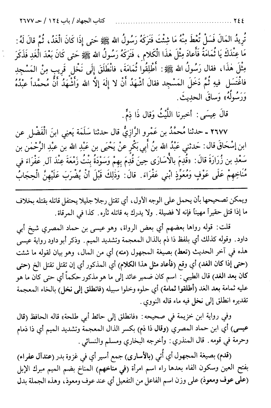[2680] (قُدِمَ) بِصِيغَةِ الْمَجْهُولِ أَيْ أُتِيَ (بِالْأُسَارَى) جَمْعُ أَسِيرٍ أَيْ فِي غَزْوَةِ بَدْرٍ (عِنْدَ آلِ عَفْرَاءَ) بِفَتْحِ الْعَيْنِ وَسُكُونِ الْفَاءِ وَبَعْدَهَا رَاءٌ اسْمُ امْرَأَةٍ (فِي مُنَاخِهِمْ) الْمُنَاخُ بِضَمِّ الْمِيمِ مَبْرَكُ الْإِبِلِ (عَلَى عَوْفٍ وَمُعَوِّذٍ) عَلَى وَزْنِ اسْمِ الْفَاعِلِ مِنَ التَّفْعِيلِ أَيْ عِنْدَ عَوْفٍ وَمُعَوِّذٍ وَهَذِهِ الْجُمْلَةُ بَدَلٌ مِنْ