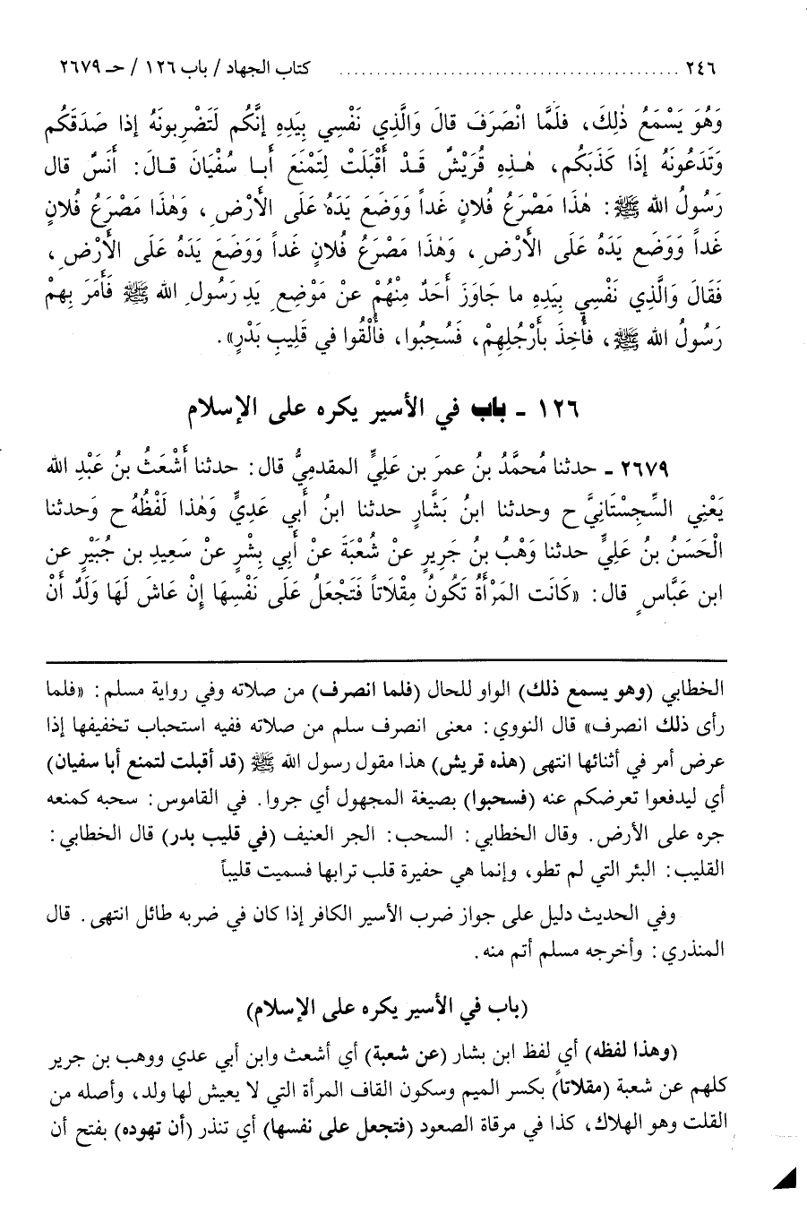 وَقَالَ الْخَطَّابِيُّ السَّحْبُ الْجَرُّ الْعَنِيفُ (فِي قَلِيبِ بَدْرٍ) قَالَ الْخَطَّابِيُّ الْقَلِيبُ الْبِئْرُ الَّتِي لَمْ تُطْوَ وَإِنَّمَا هِيَ حُفَيْرَةٌ قُلِبَ تُرَابُهَا فَسُمِّيَتْ قَلِيبًا