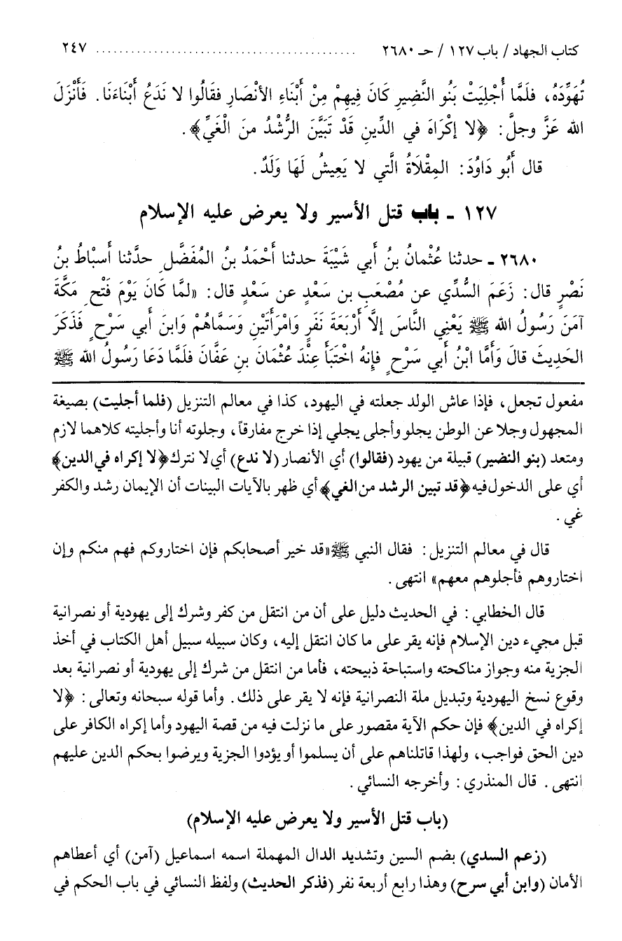 وَأَمَّا قَوْلُهُ سُبْحَانَهُ وَتَعَالَى لَا إكراه في الدين فَإِنَّ حُكْمَ الْآيَةِ مَقْصُورٌ عَلَى مَا نَزَلَتْ فِيهِ مِنْ قِصَّةِ الْيَهُودِ وَأَمَّا إِكْرَاهُ الْكَافِرِ عَلَى دِينِ الْحَقِّ فَوَاجِبٌ وَلِهَذَا قَاتَلْنَاهُمْ عَلَى أَنْ يُسْلِمُوا أَوْ يُؤَدُّوا الْجِزْيَةَ وَيَرْضَوْا بِحُكْمِ الدِّينِ عَلَيْهِمُ انْتَهَى