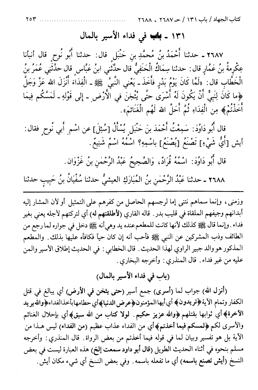 [2690] (أَنْزَلَ اللَّهُ) جَوَابُ لَمَّا (أَسْرَى) جَمْعُ أَسِيرٍ (حتى يثخن في الأرض) أَيْ يُبَالِغَ فِي قَتْلِ الْكُفَّارِ وَتَمَامُ الْآيَةِ (تريدون) أي أيها المؤمنون عرض الدنيا أَيْ حُطَامَهَا بِأَخْذِ الْفِدَاءِ (وَاللَّهُ يُرِيدُ الْآخِرَةَ) أَيْ ثَوَابَهَا بِقَتْلِهِمْ (وَاللَّهُ عَزِيزٌ حَكِيمٌ