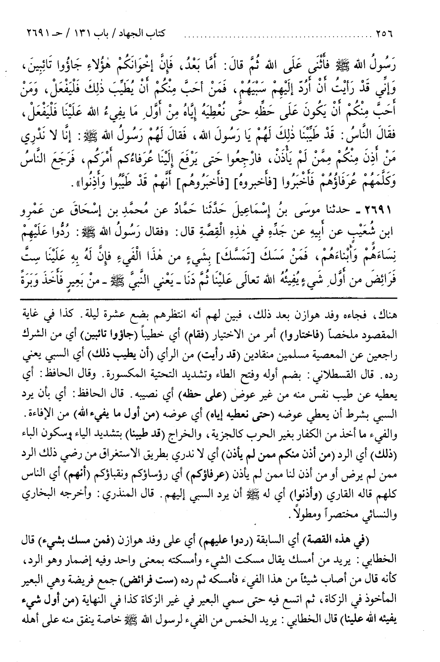 [2694] (فِي هَذِهِ الْقِصَّةِ) أَيِ السَّابِقَةِ (رُدُّوا عَلَيْهِمْ) أَيْ عَلَى وَفْدِ هَوَازِنَ (فَمَنْ مَسَكَ بِشَيْءٍ) قَالَ الْخَطَّابِيُّ يُرِيدُ مَنْ أَمْسَكَ يُقَالُ مَسَكْتُ الشَّيْءَ وَأَمْسَكْتُهُ بِمَعْنًى وَاحِدٍ وَفِيهِ إِضْمَارٌ وَهُوَ الرَّدُّ كَأَنَّهُ قَالَ مَنْ أَصَابَ شَيْئًا مِنْ هَذَا الْفَيْءِ فَأَمْسَكَهُ ثُمَّ رَدَّهُ (سِتَّ فَرَائِضَ) جَمْعُ فَرِيضَةٍ وَهِيَ الْبَعِيرُ الْمَأْخُوذُ فِي الزَّكَاةِ ثُمَّ اتُّسِعَ فِيهِ حَتَّى سُمِّيَ الْبَعِيرُ فِي غَيْرِ الزَّكَاةِ كَذَا فِي النِّهَايَةِ (مِنْ أَوَّلِ شَيْءٍ يُفِيئُهُ اللَّهُ عَلَيْنَا) قَالَ الْخَطَّابِيُّ يُرِيدُ الْخُمْسَ مِنَ الْفَيْءِ لِرَسُولِ اللَّهِ صَلَّى اللَّهُ عَلَيْهِ وَسَلَّمَ خَاصَّةً يُنْفِقُ مِنْهُ عَلَى أَهْلِهِ