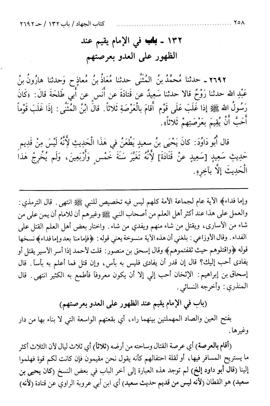 (أَقَامَ بِالْعَرْصَةِ) أَيْ عَرْصَةِ الْقِتَالِ وَسَاحَتِهِ مِنْ أَرْضِهِ (ثَلَاثًا) أَيْ ثَلَاثَ لَيَالٍ لِأَنَّ الثَّلَاثَ أَكْثَرُ مَا يَسْتَرِيحُ الْمُسَافِرُ فِيهَا أَوْ لِقِلَّةِ احْتِفَالِهِمْ كَأَنَّهُ يَقُولُ نَحْنُ مُقِيمُونَ فَإِنْ كَانَتْ لَكُمْ قُوَّةٌ فَهَلُمُّوا إِلَيْنَا (قَالَ أَبُو دَاوُدَ إِلَخْ) لَمْ تُوجَدْ هَذِهِ الْعِبَارَةُ إِلَى آخِرِ الْبَابِ فِي بَعْضِ النُّسَخِ (كَانَ يَحْيَى بْنُ سَعِيدٍ) هُوَ الْقَطَّانُ (لِأَنَّهُ لَيْسَ من قديم حديث سعيد) أي بن أَبِي عَرُوبَةَ الرَّاوِي عَنْ قَتَادَةَ (لِأَنَّهُ