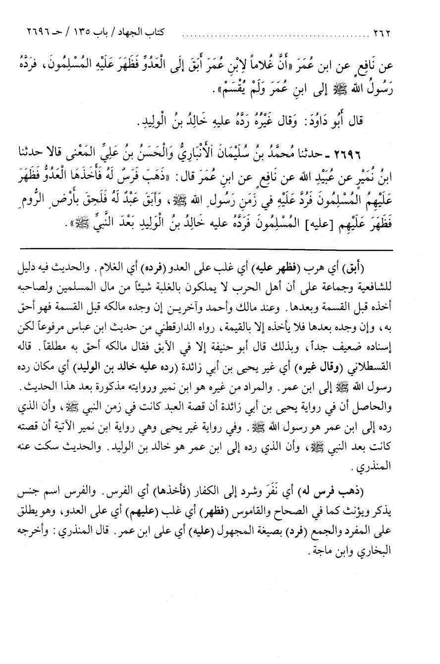 [2699] (ذَهَبَ فَرَسٌ لَهُ) أَيْ نَفَرَ وَشَرَدَ إِلَى الْكُفَّارِ (فَأَخَذَهَا) أَيِ الْفَرَسَ