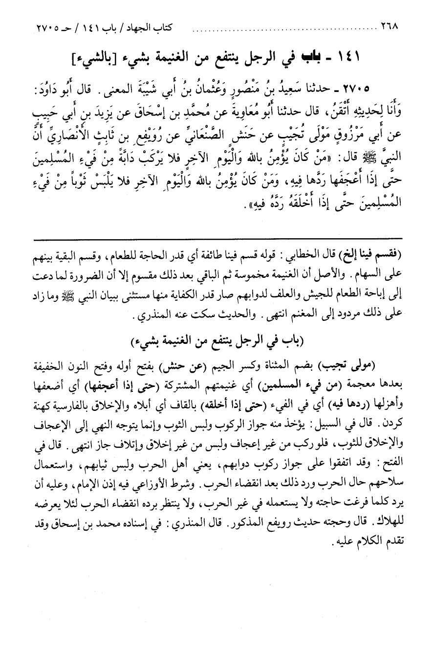 [2708] (مَوْلَى تُجَيْبَ) بِضَمِّ الْمُثَنَّاةِ وَكَسْرِ الْجِيمِ (عَنْ حَنَشٍ) بِفَتْحِ أَوَّلِهِ وَفَتْحِ النُّونِ الْخَفِيفَةِ بَعْدَهَا مُعْجَمَةٌ (مِنْ فَيْءِ الْمُسْلِمِينَ) أَيْ غَنِيمَتِهِمُ الْمُشْتَرَكَةِ (حَتَّى إِذَا أَعْجَفَهَا) أَيْ أَضْعَفَهَا وَأَهْزَلَهَا (رَدَّهَا فِيهِ) أَيْ فِي الْفَيْءِ (حَتَّى إِذَا أَخْلَقَهُ) بِالْقَافِ أَيْ أَبْلَاهُ وَالْإِخْلَاقُ بِالْفَارِسِيَّةِ كهنة كردن